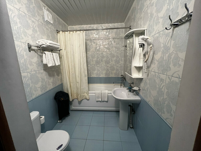 Просто прекрасный отель! Персонал доброжелательный, везде чисто, есть 3 бани в аренду, в каждом номере холодильник, завтрак по меню на выбор яишница с сосиской/ блинчики с творогом/ блинчики с мясом. Есть кофемашина.