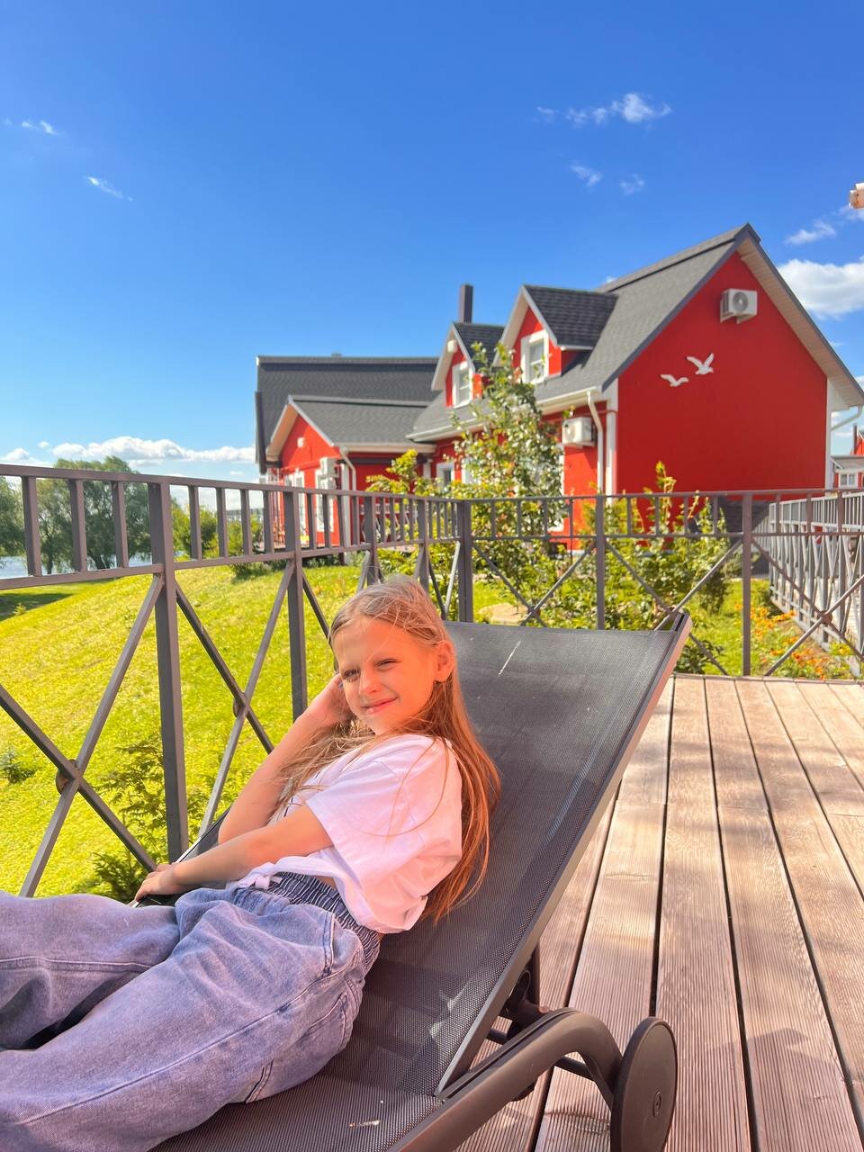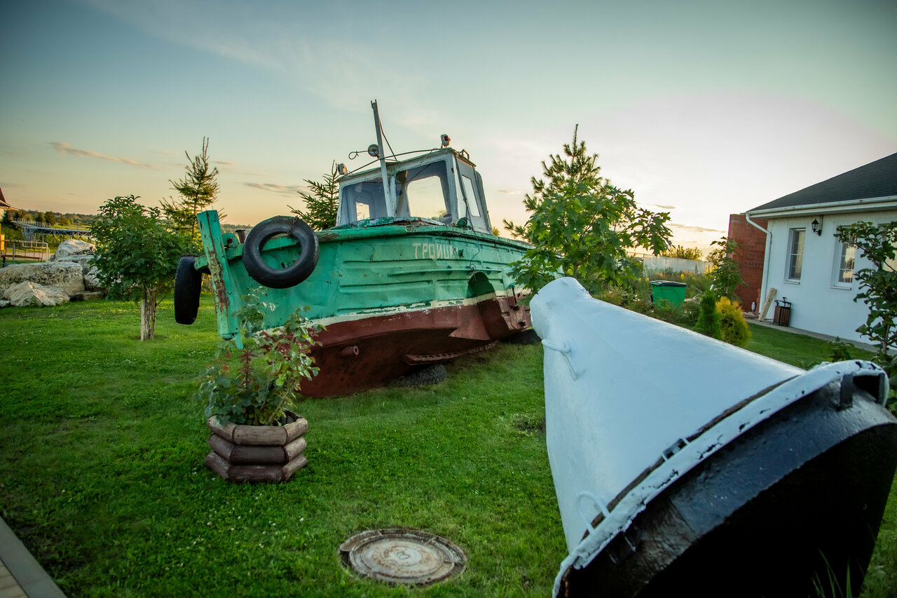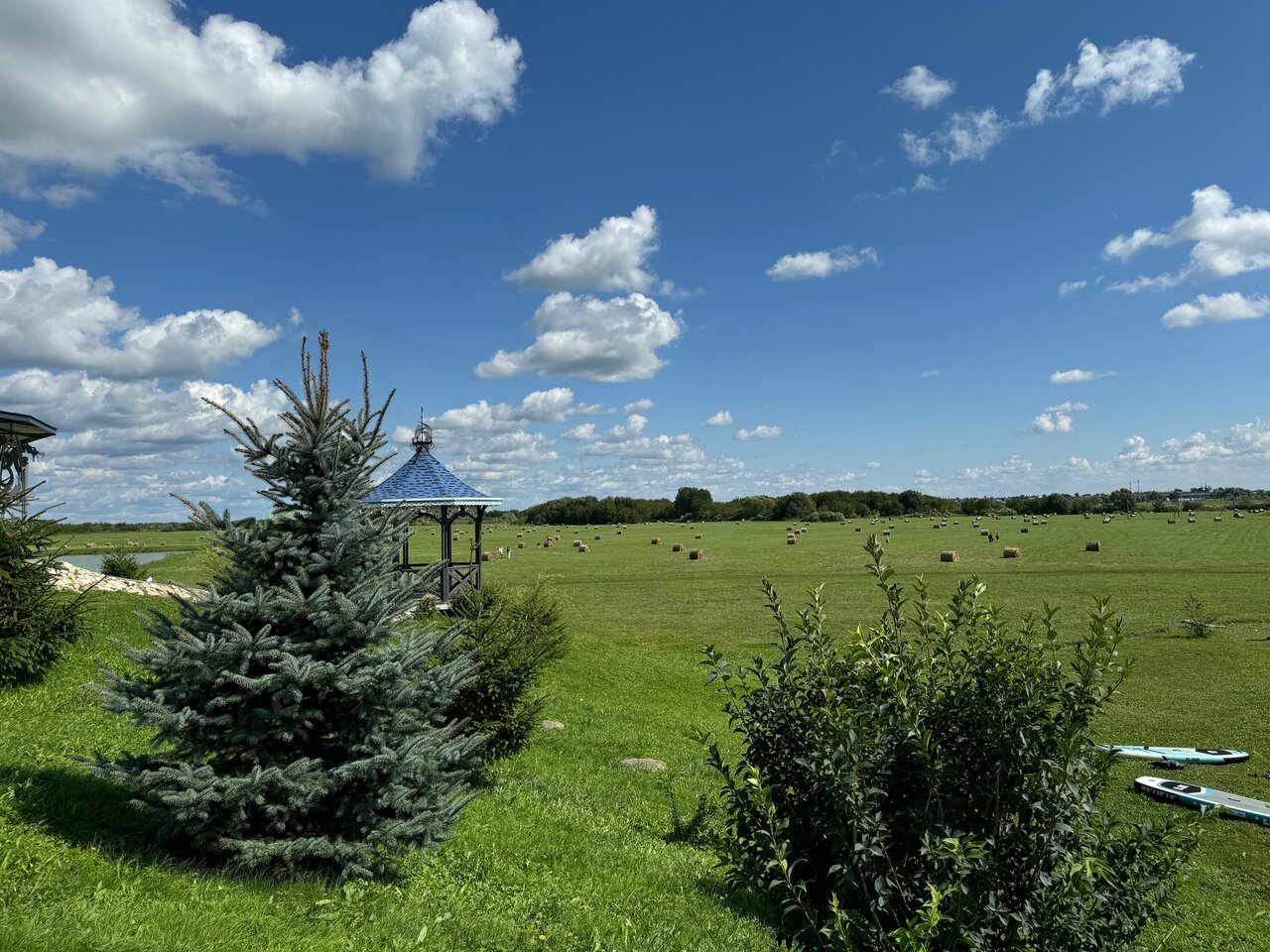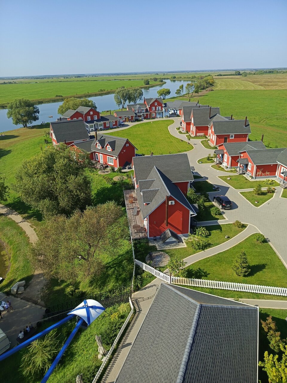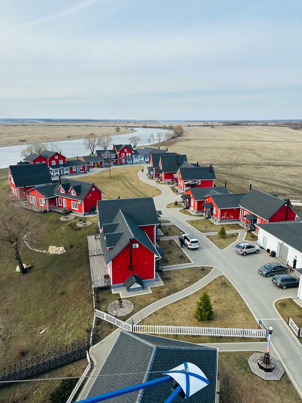 Прикольное место в плане идеи и реализации. Номера очень понравились. Завтраки отличные. Есть своя пристань, лодки и сапы — отличное развлечение. Рядом поле/кони/сенокос. Удобно если в планах покататься по округе — рязань и солотча под боком. Местечко крайне живописное. Иногда над головой на посадку заходят бомбардировщики — маяк для них ориентир. Нам с ребенком понравилось, супруге не зашло особенно их ночные учения взлет-посадка. Из минусов странный рестик — к еде вопросов нет даже наоборот, но меню прям странное, не каждому зайдет. Альтернативы — шашлычить самому? Ну такое не за тем ехали. И просто тьма гнуса повсюду — что на улице что в номере. Куча людей которые приезжают на выходных просто поглазеть. Домики в стадии недостроя немного удручают.