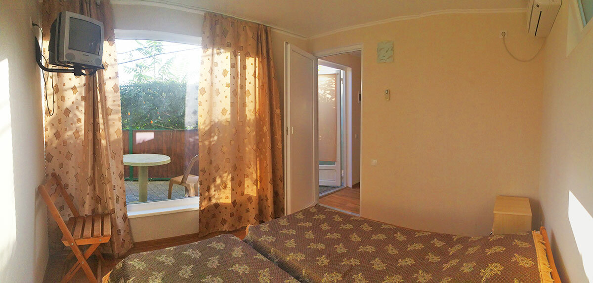 Самый главный недостаток- в номерах нет чайника, чашек или стаканов с тарелками.За всем этим надо ходить на летнюю кухню в 40 метрах, что в жару не очень приятно,а когда придёшь в момент принятия пищи большинством проживающих(завтрак или ужин) может не быть свободных чайников, сковород или кастрюль, чтобы налить из спота кипятка и подогреть себе чай и яишницу сварганить. Телевизор показывает плохо по причине плохого кабельного сигнала, причем самые востребованные центральные каналы наиболее плохо! Также не очень удобно добираться до моря, хотя не далеко, но дорога по горе извилиста и плохого качества. А так само жилище не плохое с хорошей верандой с уличным рукомойником.
