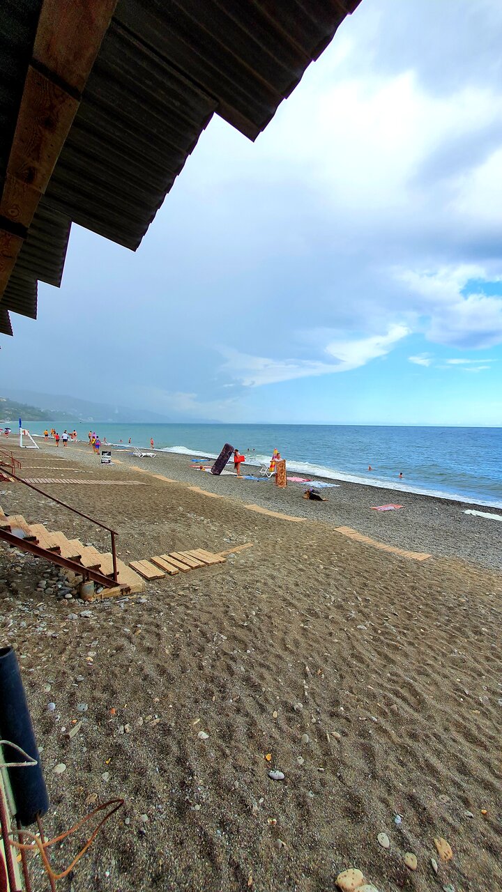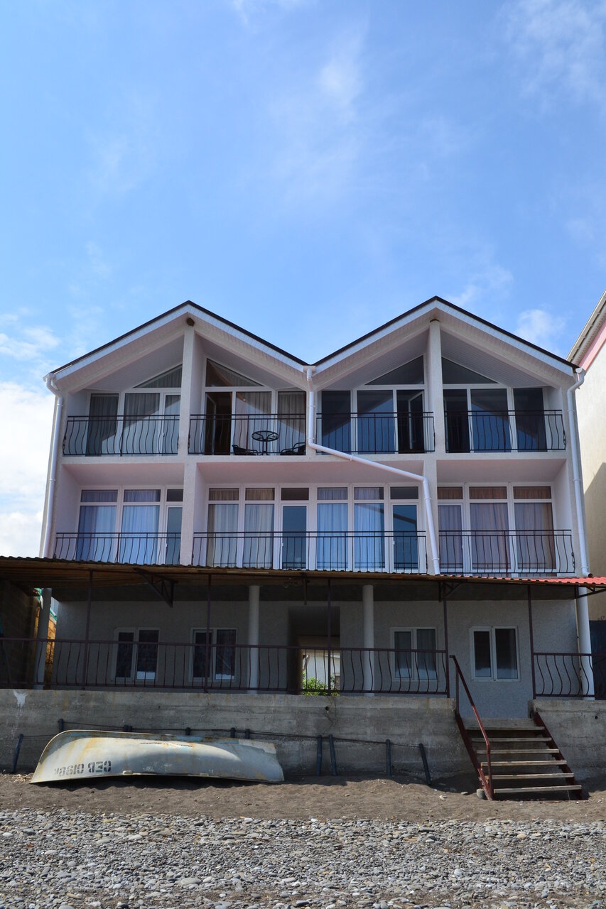 Прямо на пляже! Очень чисто в номере, ухоженный зеленый двор с разными плодовыми. Шикарный куст лавра, мне так и хотелось его потрогать) Ирина помогла с парковкой. Есть шикарная терраса, через нее выход на пляж. Есть возможность постирать за 150 руб. Все отлично, рекомендую!