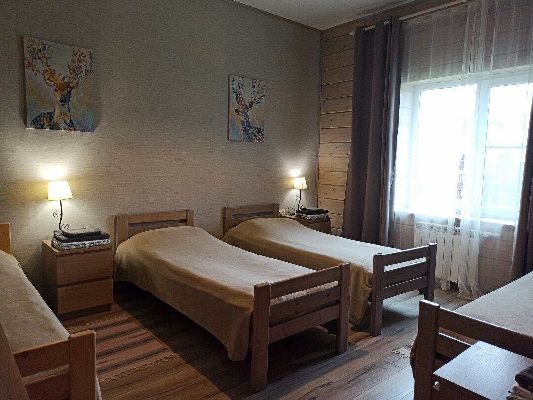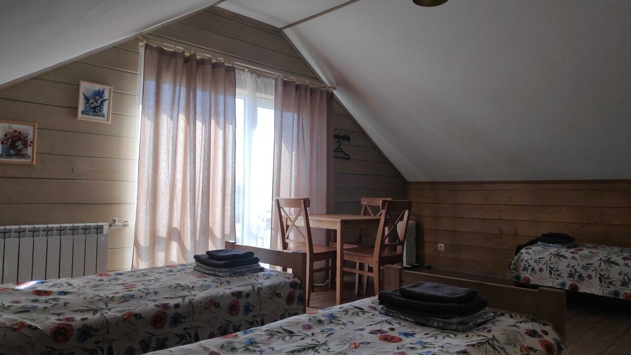 Приятное уютное место, вежливый хозяин, есть батут, дартс, качели для деток, диванчик в номере правда маловат для взрослых, ноги свисают, но у нас разнополые дети, поэтому мы положили их на раздельные кровати, а с мужем легли на диван)