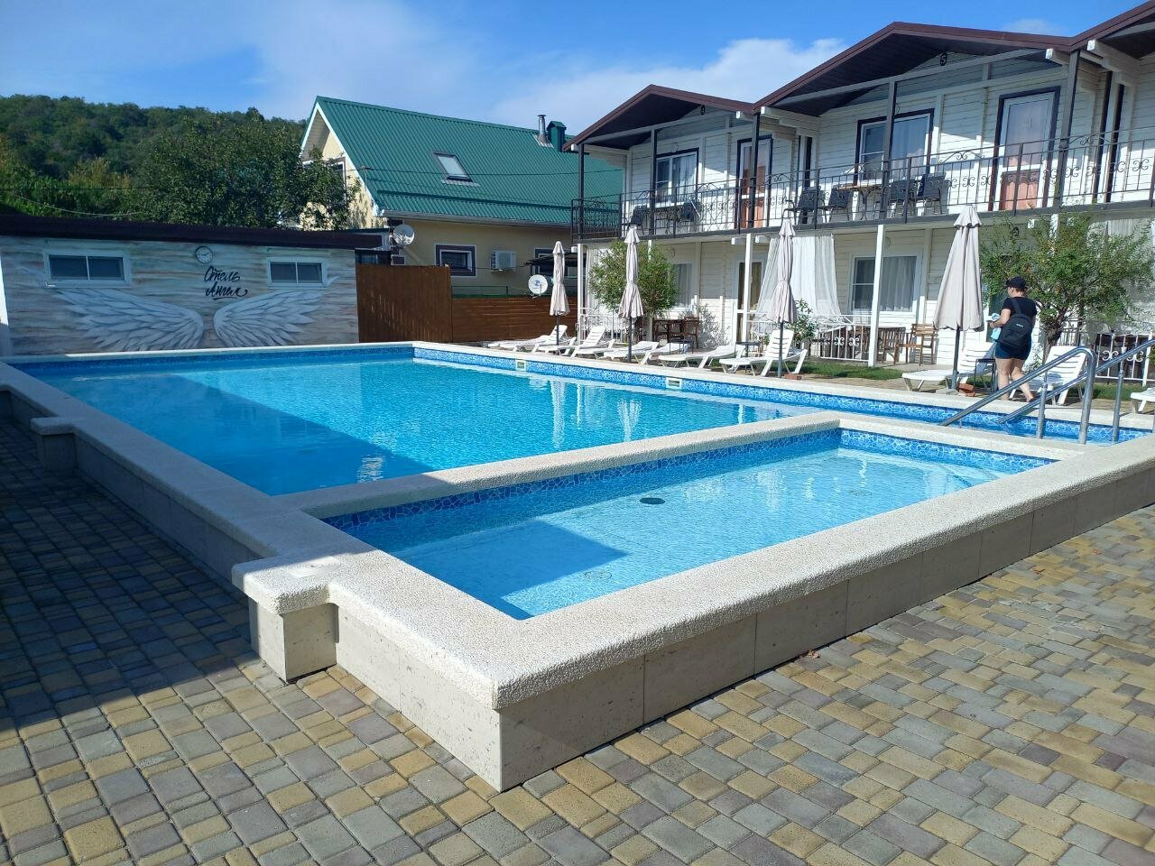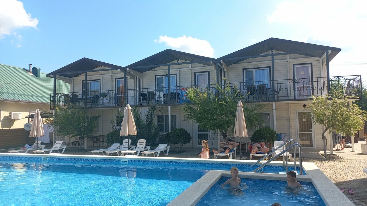 Забрал сына с лагеря и решили остаться на пару дней. Выбор пал на эту гостиницу и не пожалели. Отличная гостиница! Тихо и спокойно. Небольшая территория, но все продумано для удобства и комфорта. Номера не затасканные, бассейн большой и чистый. Кухня всем необходимым оборудована, столов много, хватает всем проживающим. Дорога к морю бетонная, минут 10 неспешной ходьбы. В гостинице есть магазин и кафе. В кафе очень вкусно готовят! Рядом есть столовая. Администратор общительная, при заселении поговорили на свободные темы, провела экскурсию по территории, все показала и рассказала. Мы остались очень довольны, уезжать не хотели!