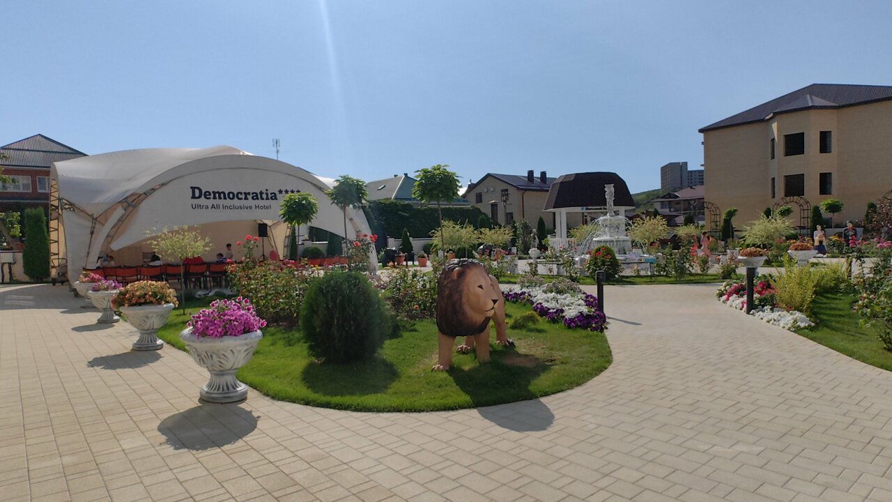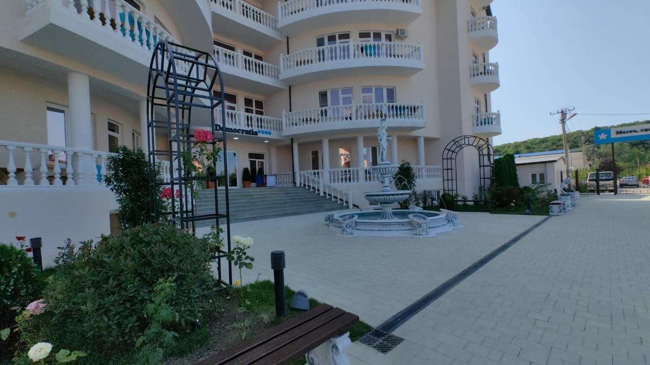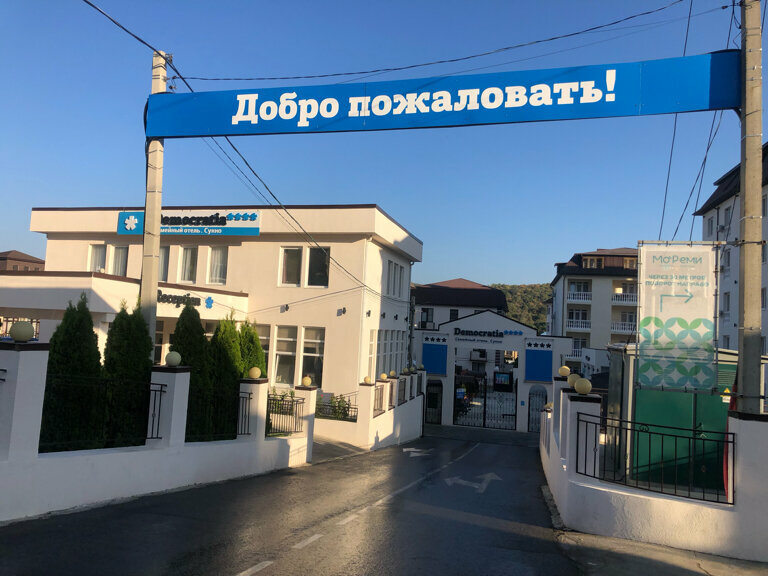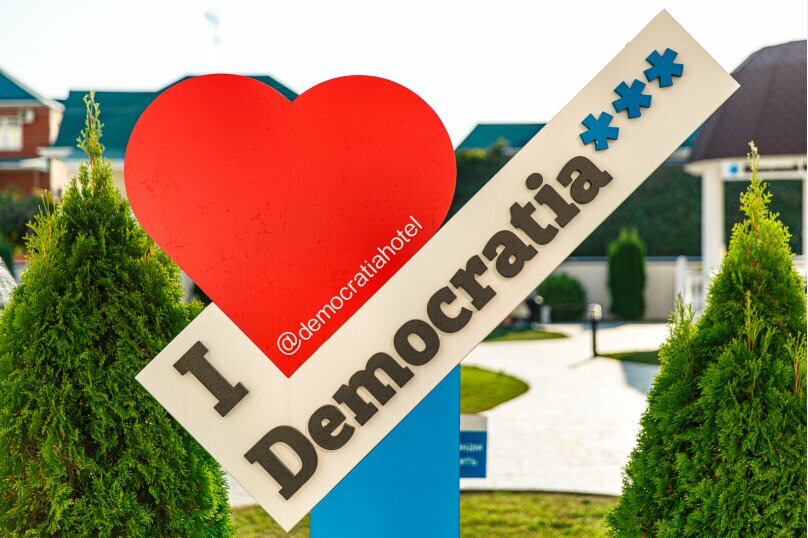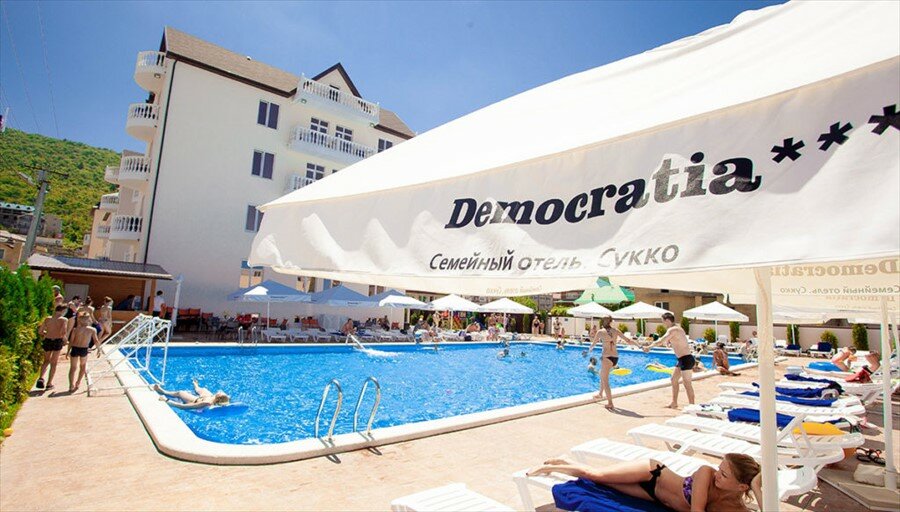 ‘Приехали в »Демократию» в августе, остались очень довольны. У отеля большая территория, много зелени. Номера светлые и уютные, уборка ежедневная. Пляж хоть и далеко, но автобус ездит часто. Питание просто огонь, анимация для детей на высоте. Советую!’