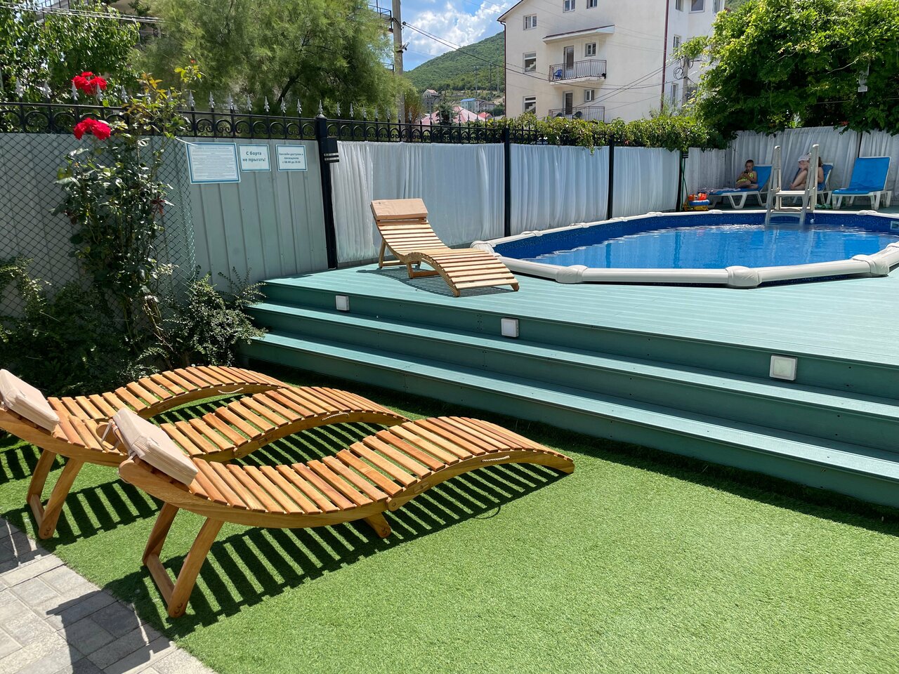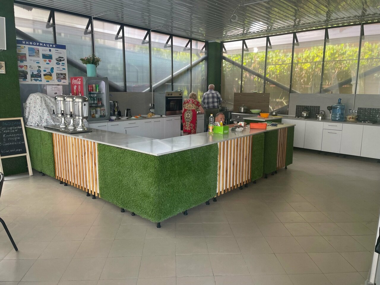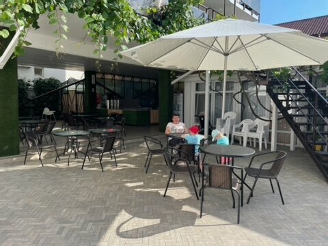 Отличная гостиница. Именно для семейного отдыха с детьми. Много детей. Хорошая детская площадка и бассейн. Каждый вечер мультфильмы. Всегда чисто и уютно. Добрые и отзывчивые хозяева. Удобдные чистые номера. Всё есть для хорошего отдыха. Общая кухня во дворе. Плита на каждые два номера. Холодильник как в номере небольшой так и на кухне общий. Есть мангал. Красиво и уютно. До моря не торопясь пешком 15 минут.