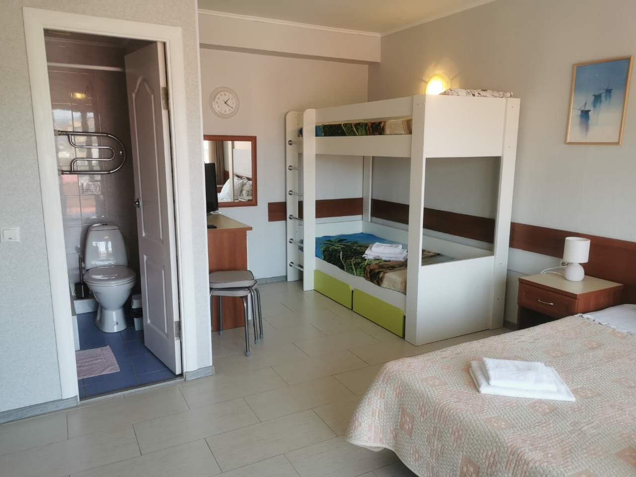 специальная цена до 1 июля Уютный комфортабельный номер для семьи с двумя детьми, оснащен сплит системой, LCD TV, холодильник, санузел с душем, терраса со столиком и креслами.
