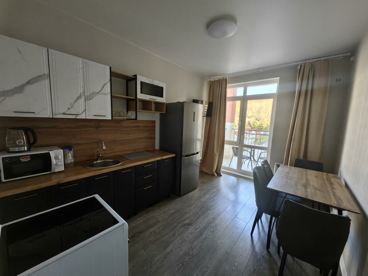 Немного разочарован. Ожидали большего. Если звездочки- не больше двух. Из положительного. Отличная локация ( при наличии авто), безопасность, чисто. Маленькие комнаты, кухонька. Не самая хорошая ( дешевая мебель), слабенький ремонт. Для переночевать- нормально. Отдыхать- увы, нет.