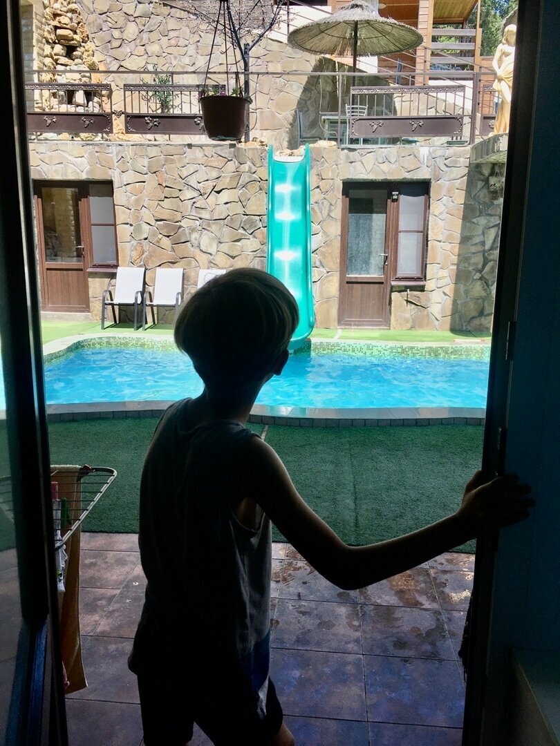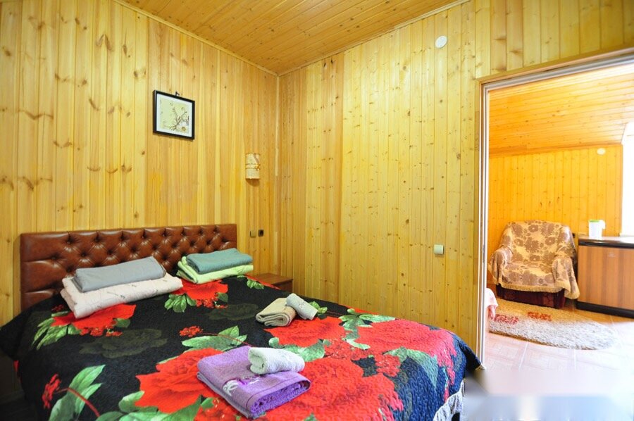Отель интересный, не обычный. Расположение отеля в лесу, примерно 3 км от пляжа. ( хозяин Ашот в 9ч отвозит на море, в 3 ч забирает). Мы ездили на своей машине ( хозяин даёт пропуск на парковку около пляжа). Есть бассейн, зона для шашлыка, отдельные беседки. В номере кровать не 2-х спальная!! (два матраса соедененных вместе с большой дыркой посередине.) Есть небольшой холодильник, телевизор, кондиционер. На первом этаже кухня с посудой для самостоятельного приготовления пищи. На кухне грязновато ( в предыдущем гостевом доме каждый готовил и убирал за собой, но хозяйка каждое утро меняла губки на новые, вешала чистые полотенца, доливала /досыпала чистищие, все приводила чуть ли не в идеальное состояние. Здесь же такого нет, губки грязные, половину кружек выщербленные ( зачем ставить гостям такие кружки???), посуды не особо много. Вода с запахом сероводорода, мы покупали воду на чай, чистить зубы, мыть фрукты.