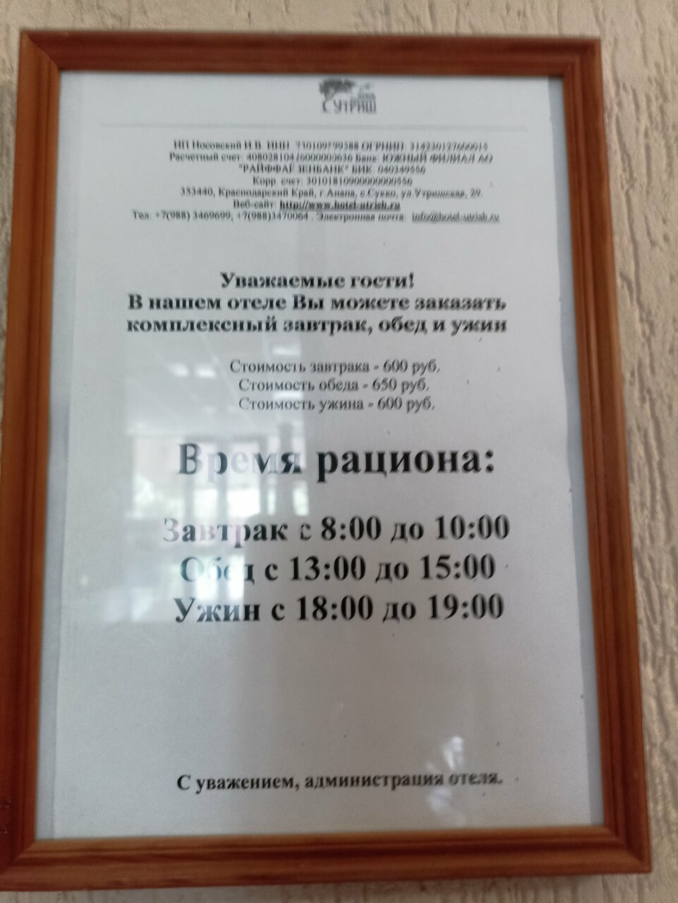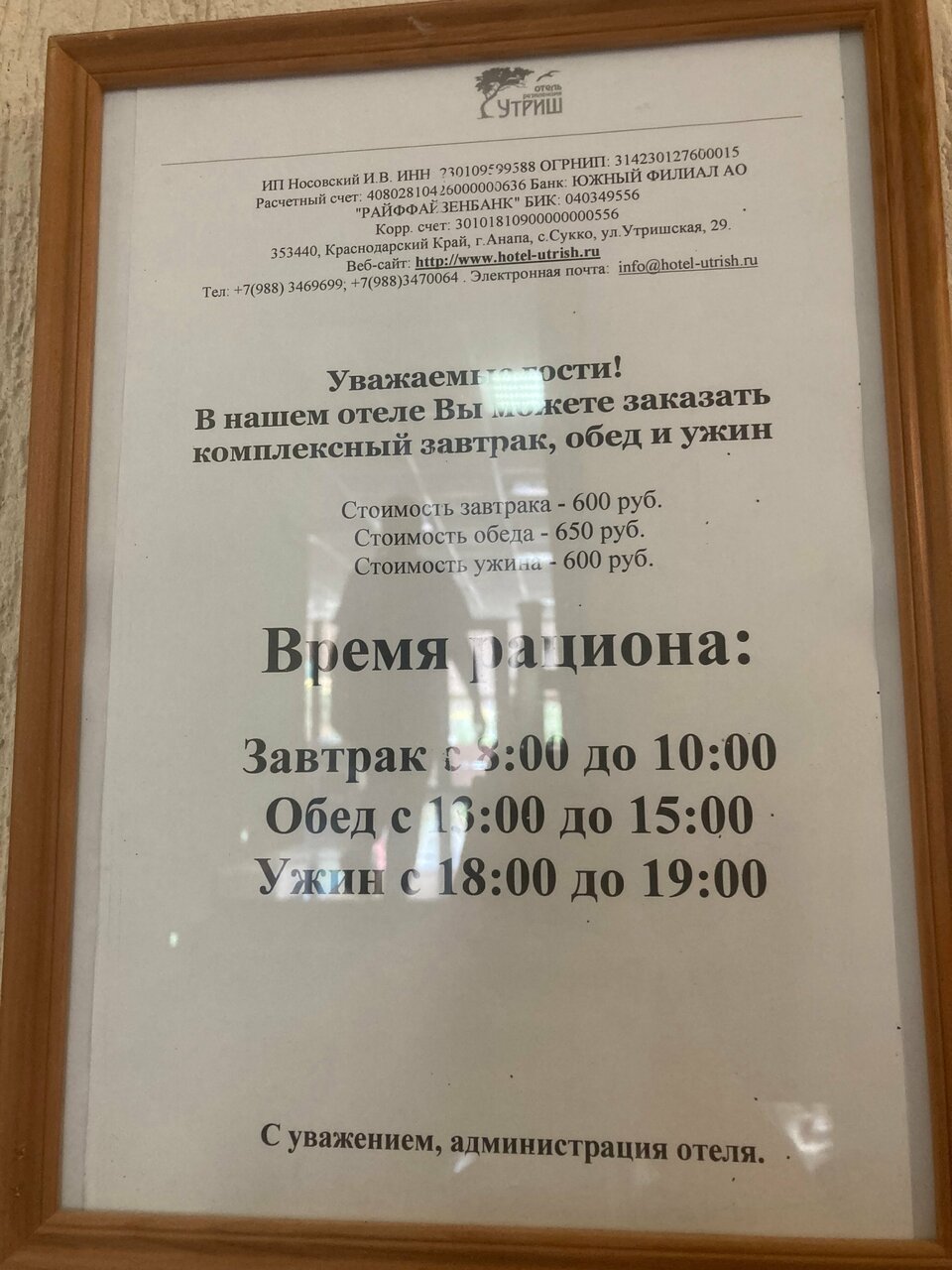 Отель на три с плюсом, номера убирают редко, кормят очень очень просто и очень дёшево. Из плюсов бесплатная стоянка и барчик во дворе. В общем сервис соответствует стоимости проживания на 100%. Но самое страшное разочарование это сам поселочек Сукко, очень грязно, на пляже мусор, по дороге к пляжу мусор, в море тоже мусор, не смотря на то что пляж небольшой его не убирают вообще. Приходилось уезжать купаться в соседние поселки, в Сукко мне кажется это просто не безопасно, давно не видел такого загаженого побережья, при этом лежак под навесом стоит 650р на пол дня)))) советский деревянный лежак, под таким же советским навесом. Были там в августе 2019