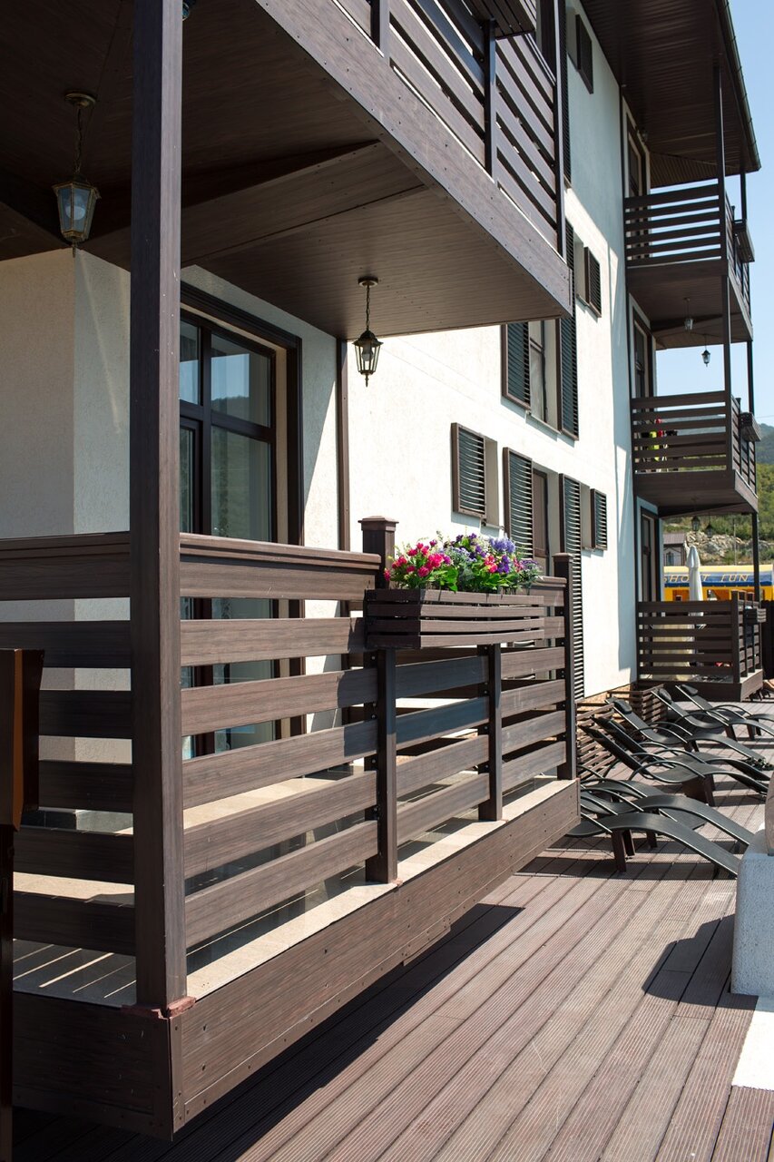 Постояльцам номеров первого этажа с бокалрм вина на улице не провести время.. Балконов нет, а территория бара закрыватся в 20.00 Некоторые администраторы (не все!!!) неприветливы. Розетки в ванной комнате нет. Завтрак вкусный!!!