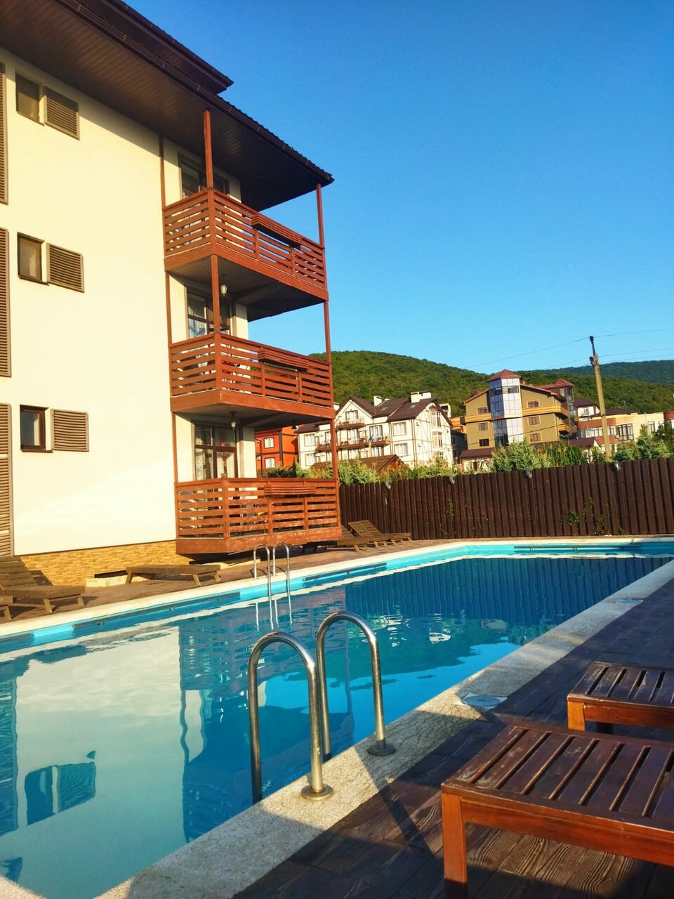 - Хорошее соотношение цены и качества.; Наличие магазинов и инфраструктуры рядом.; Бесплатная парковка.; Наличие бассейна (в том числе детского).; Панорамные окна в номерах.