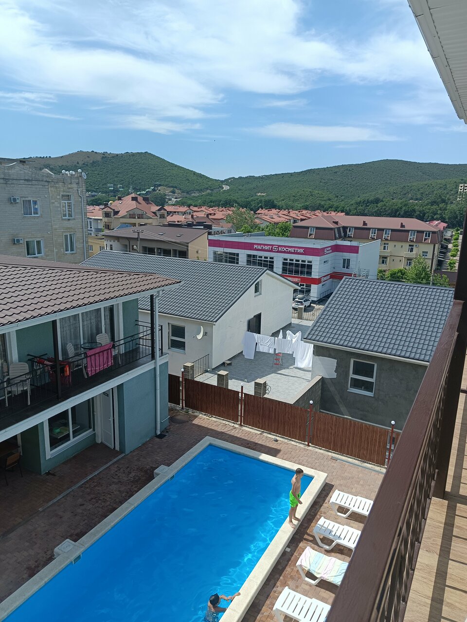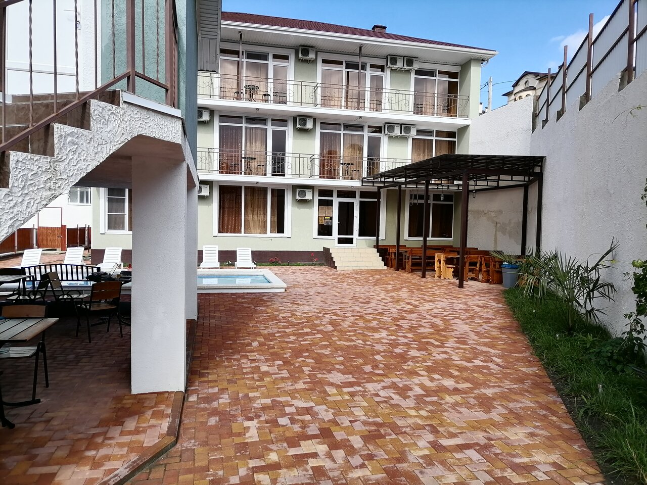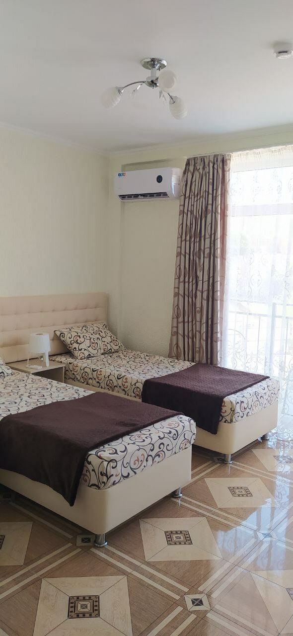 Отдыхали с семьёй( 4 человека) этим летом в августе.Все очень понравилось ,номер у нас был 2х комнатный,что очень удобно с детьми.В номере есть всё необходимое и даже просторный балкон.Есть летняя кухня,бассейн,а также мангальная зона и столики где можно вечерком присесть.Хозяин Александр приветливый,всегда подсказывал где лучше отдохнуть,покушать и даже есть свойское вино,но мало.
