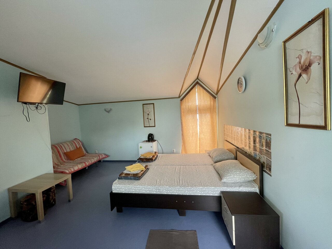 Приехали в эту гостишку по советам знакомых. Сказать,что тут хорошо,это ничего не сказать! Мы семья из двух взрослых и двух детей 3 и 4 года. Номер был стандарт(хотя мы думали,что полулюкс)номер большой,с эркером, двойная кровать,кресло раскладной,шкаф,посуда,душ,туалет,телевизор,кондей.Детям есть где играть.На этаже балкон,сушилка. Все очень чисто и аккуратно.Есть общая кухня и навес как бы на улице,как кафешка. Огромный бассейн и детский бассейн. Чистейший.Каждый деть чистят. Есть фонтан,несколько разных качелей. Песочница. Дети были в восторге. Персонал весь приветливый и отзывчивый. Сразу реагируют на любую просьбу. Звукоизоляция на 5+.Это важный аргумент, при отдыхе с детьми. Однозначно сюда будем возвращаться. До моря минут 10-15. Воздух чистейший. Только позитив от пребывания в этом городе и гостишке!!