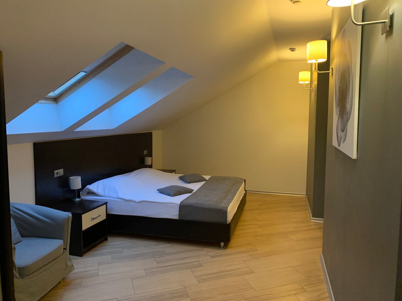 Отличная гостиница! Классный номер под крышей с мансардными окнами. Просторный и очень стильный. Классная кровать! Вкусный плотный завтрак со шведским столом в ресторане Честер (включён в стоимость). Также подают свежесваренный кофе!