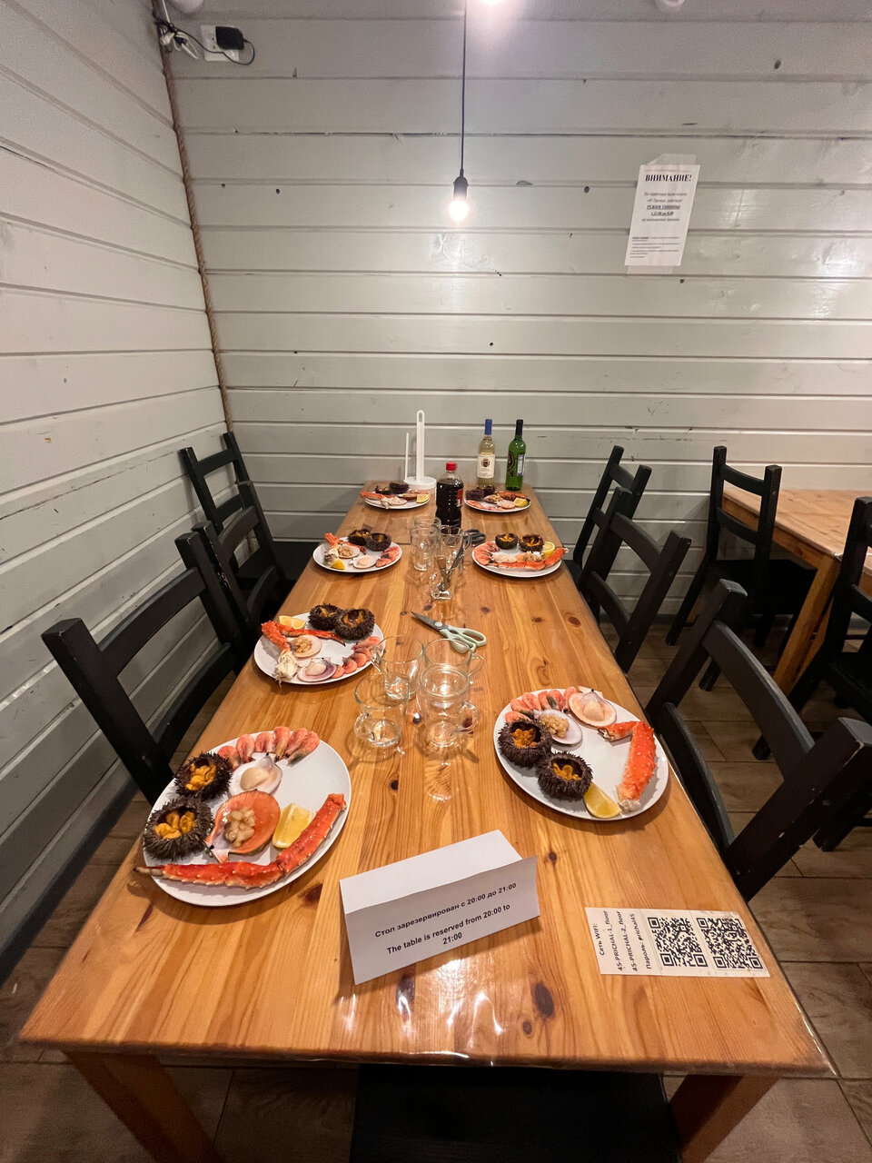 Место красивое, возможно даже вкусное. Отзыв будет не очень справедлив по отношению к конкретному заведению, потому что в него мы не попали. Я бы поставил 2 звезды, если бы можно было оценить весь общепит Териберки, организация — дно. Нет мест, нет предварительного бронирования, нет живой очереди. Из ресторанов просто выставляют на мороз и говорят: ну попробуйте попозже зайти. На вопрос какого время ожидания ответ 1: у нас нет очереди, молодой человек, идите отсюда, вы мешаете посетителям. Я. Пришел. Отдать. Свои. Деньги. И. Получить. За них. Еду! Просто шлют в пешее эротическое, ладно бы так было в 1 месте, но так везде, так всегда. Надо отдать должное, кормят сытно, кормят вкусно, кормят дорого. Но даже если вы пришли с кучей денег – пойдете лесом, мест не