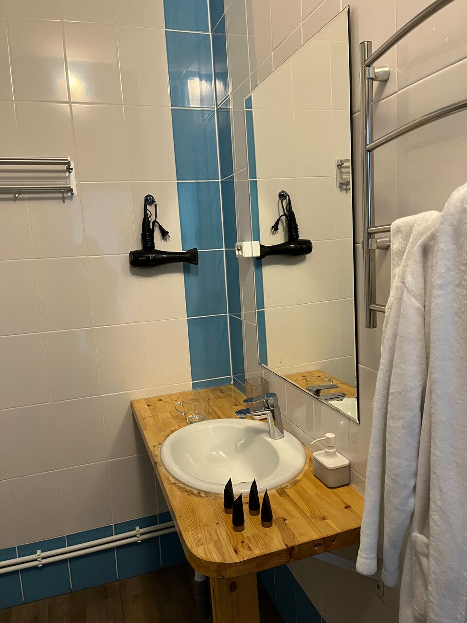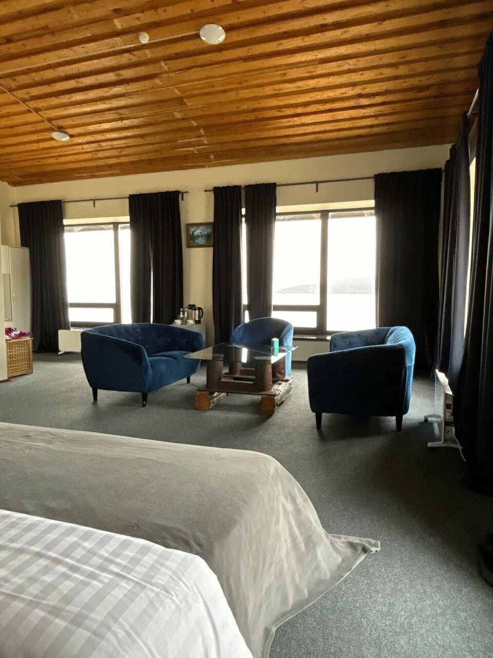 Построен отель очень круто. Прекрасный панорамный ресторан, холл с библиотекой, всё очень красиво оформлено. Завтрак вкусный и разнообразный. Мне понравились котлеты с олениной и крабовый салат. Приходить на завтрак лучше или к 9-00 или попозже, т. к. самые ранние гости очень активны и потом надо подождать пока кухня обновит продукты. Но, номерной фонд уже солидно изношен и требует реконструкции. В нашем номере (стандарт за 9.6 тыс.) мебель кое-где была со сколами, поддон в душевой кабинке с чёрной плесенью, полочка для принадлежностей вся ржавая(фото). Телевизор работает от интернета и когда вечером гости массово подключаются к wi-fi, смотреть его не получится. Поэтому снимаю звезду. Из плюсов- халаты и очень хорошие тапочки, чайник и всё для чая, воду можно пить из под крана.