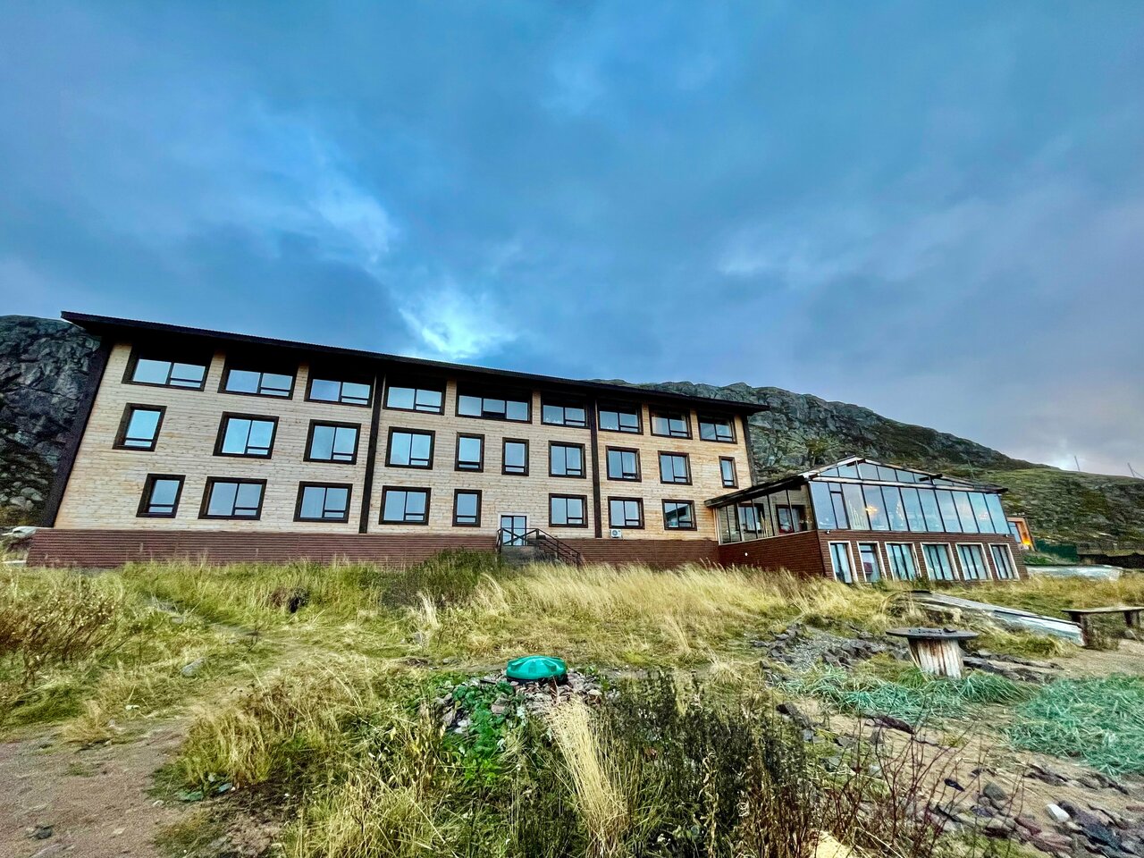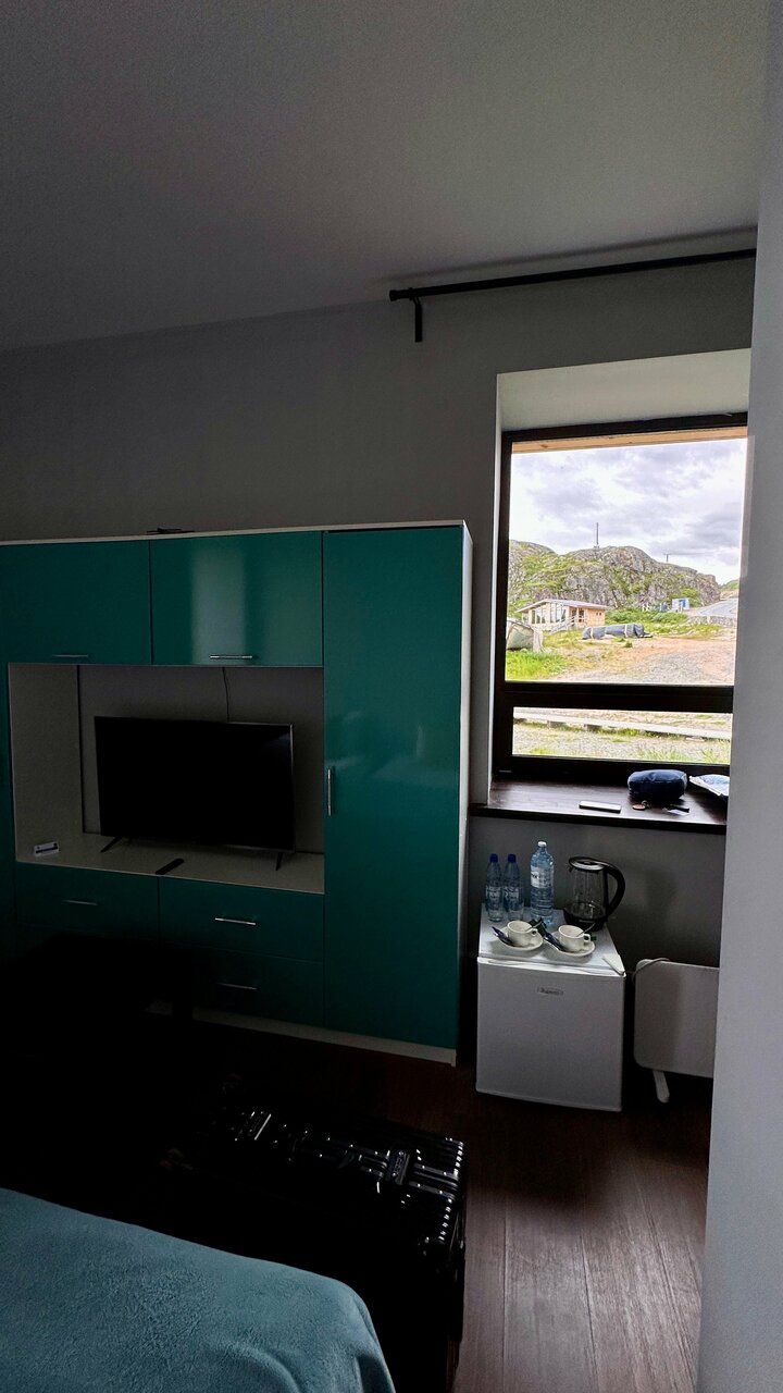 Пожалуй лучшая гостиница в поселке. Расположена между старой и новой Териберкой. Вполне можно добраться пешком в любое место. Имеется напротив большая автостоянка. Отличные номера, особенно люкс на третьем этаже с видом на море. Вид из окон радовал все время. Просторные ванные комнаты. Смена полотенец каждый день. Особо отмечу наличие собственного генератора и скважины. Проблем со светом и водой, как в других отелях, не было. Впечатлил завтрак. Большое разнообразие блюд и качественное приготовление. Администраторам, а особенно официантам в ресторане необходимо подучиться, им не хватает вежливости и внимания к клиентам. К минусам также можно отнести очень близкое расположение к дороге, буквально три-четыре метра.