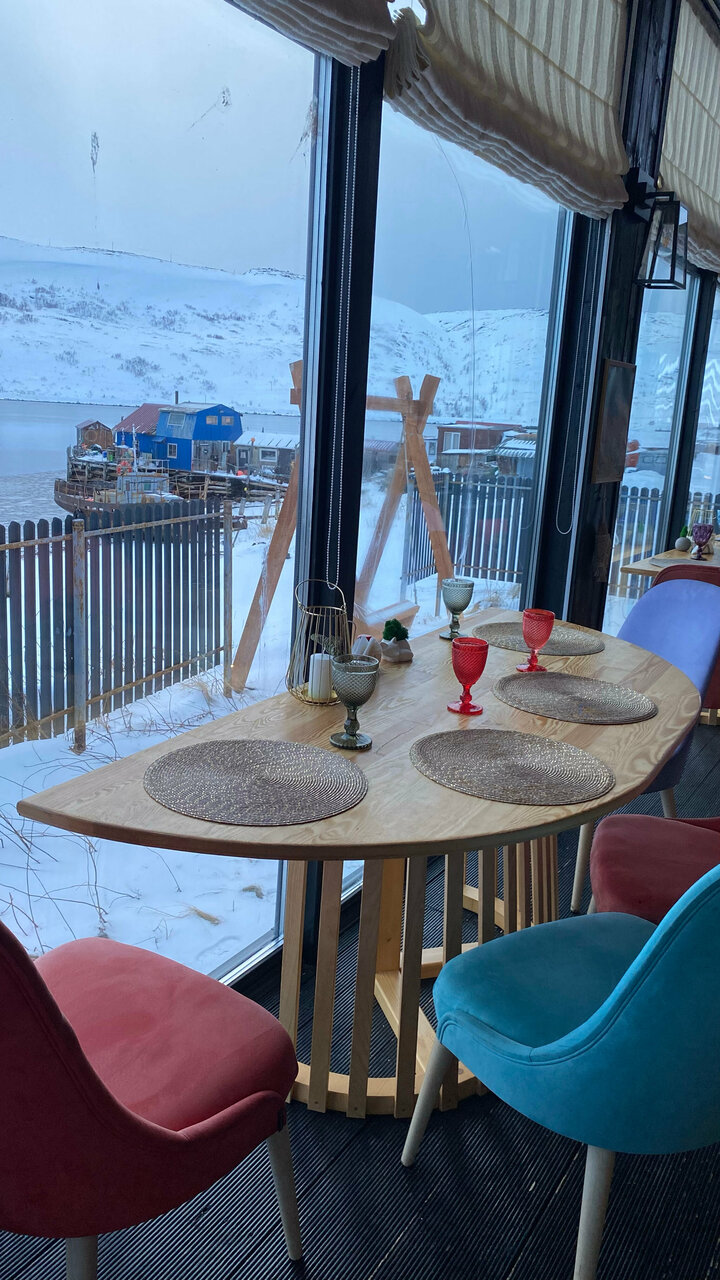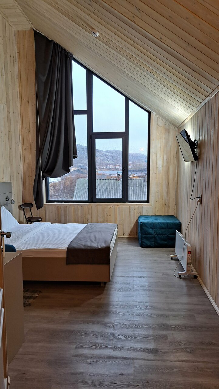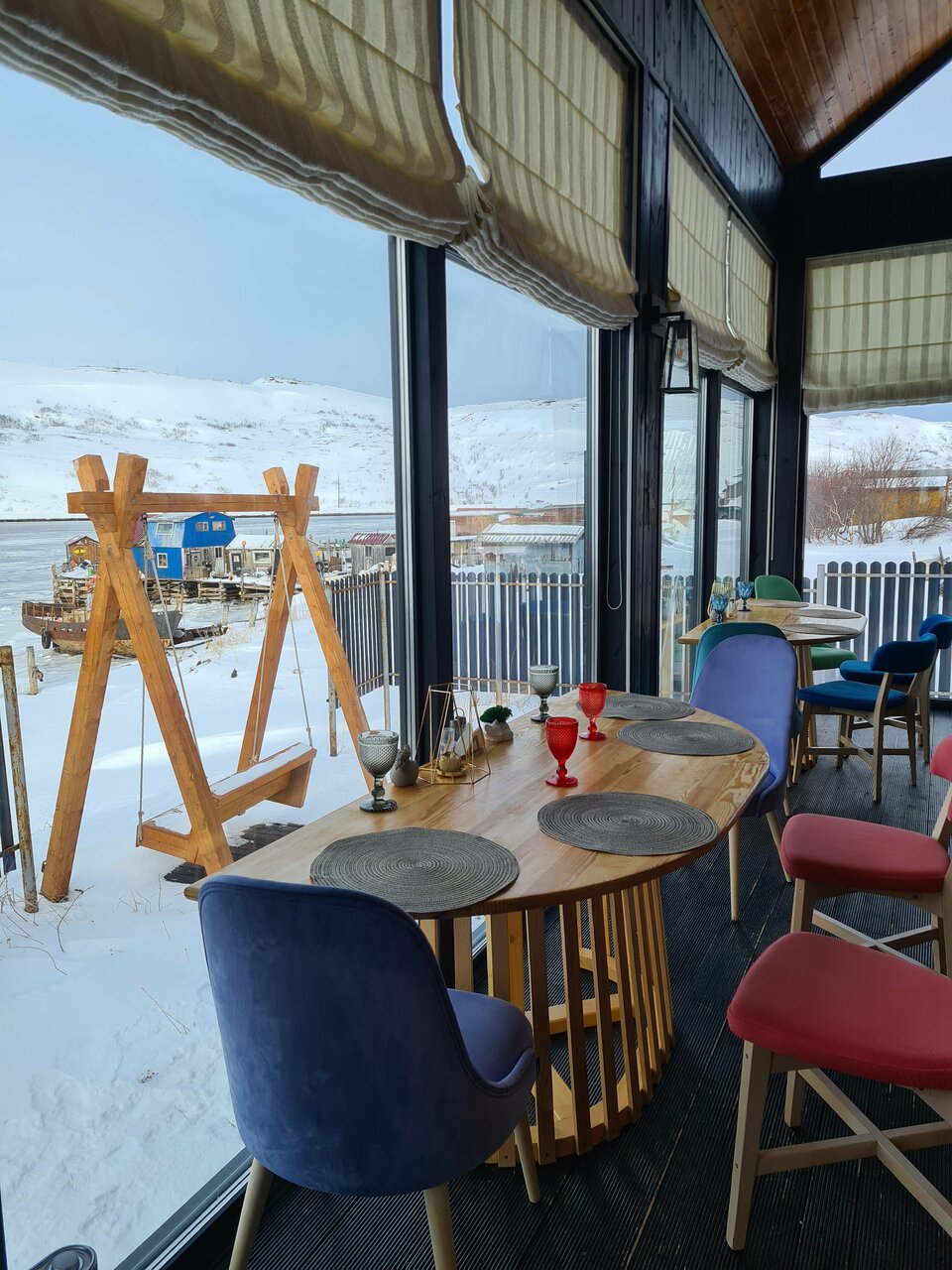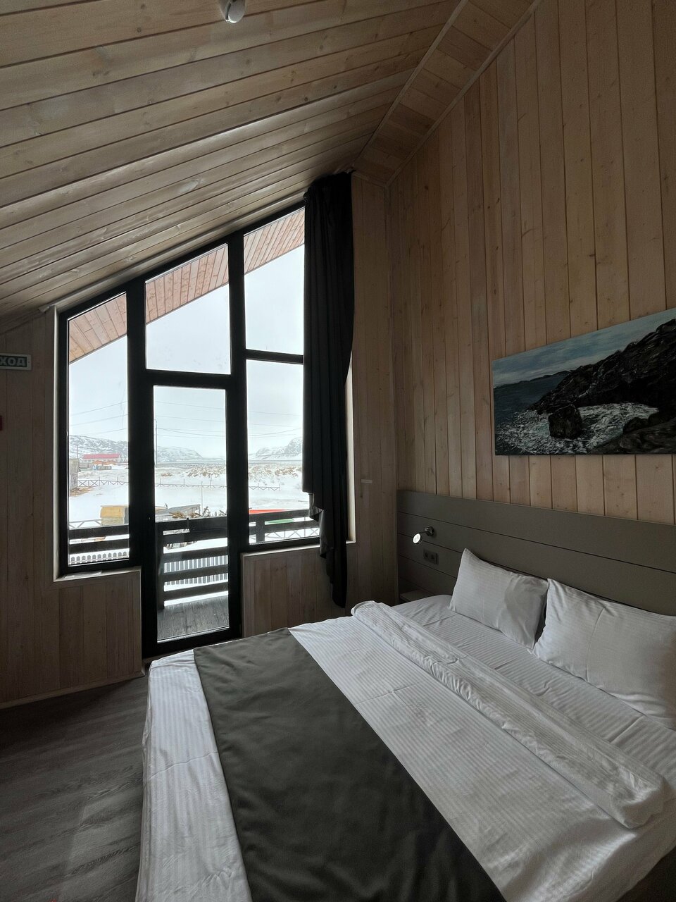 Наверное во всей Териберке — это лучшее место. Отличный вид, в номерах всё новое. Что огорчило -так это уборка. Мусор даже не забирали 3 дня. Под кроватями грязно. Я это посмотрела, потому что мы заехали с ребёнком, который везде лезет. И поменяла бы завтрак на шведский стол, а не на раздачу всем по очереди одного и того же. Но это просто рекомендация, а так завтрак хороший. Можно заказать еду не только на завтрак, можно сдать вещи в стирку. С любым вопросом можно обращаться к персоналу. Настя просто булочка, очень милая администратор. До пляжа, где около ресторана лежит скелет кита — 5 минут пешком. Ещё вернёмся, я думаю