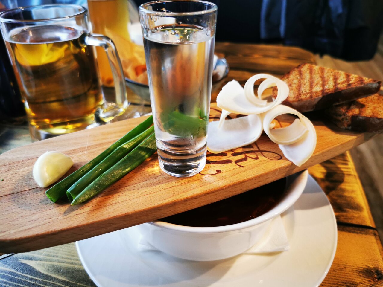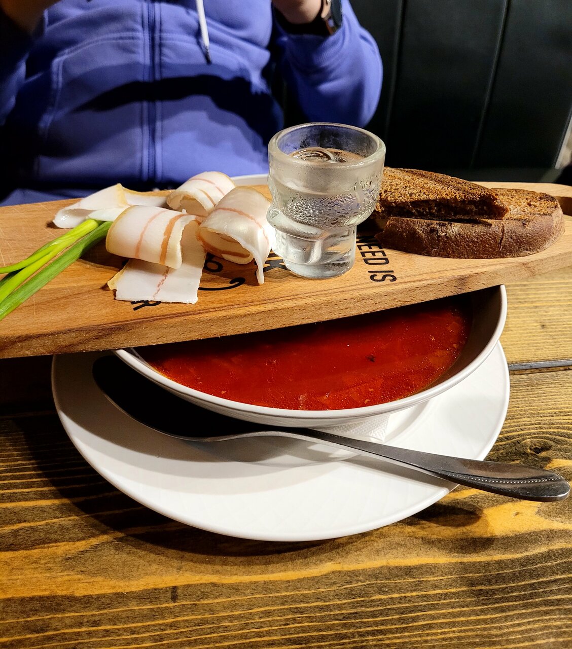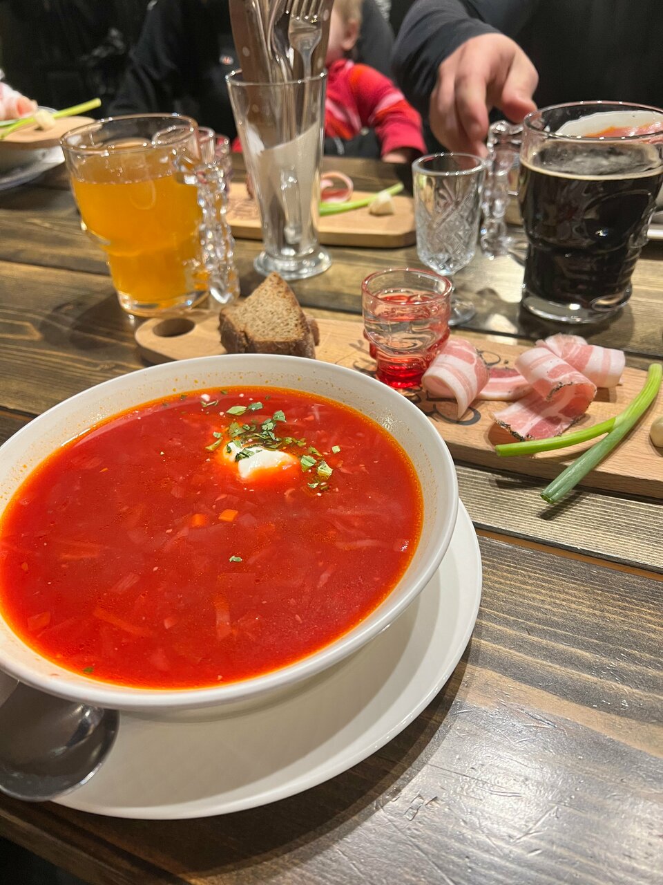 Очень неплохой борщ (с рюмочкой в качестве комплимента), блины с сёмгой тоже весьма вкусные. И порции огромные)