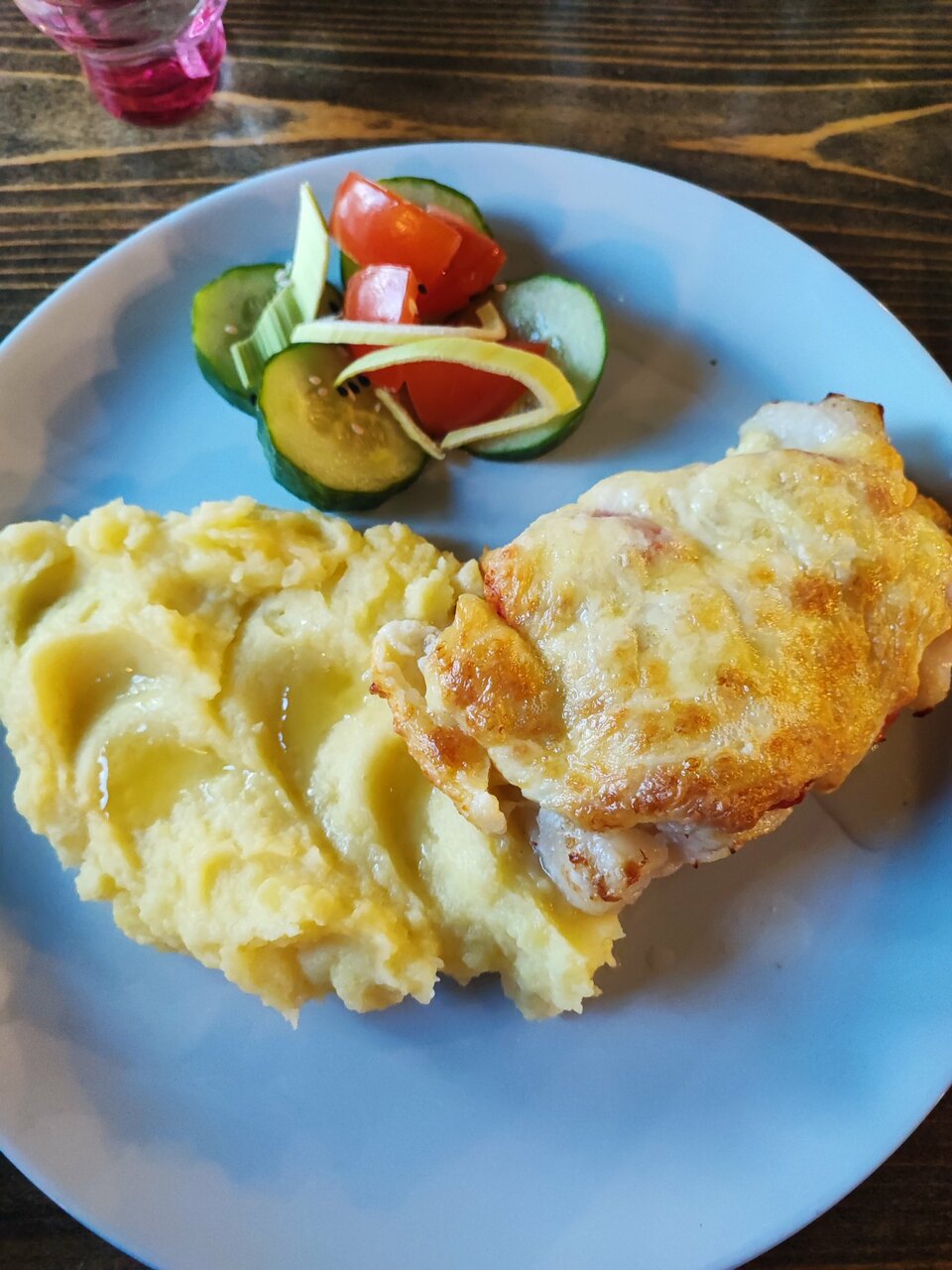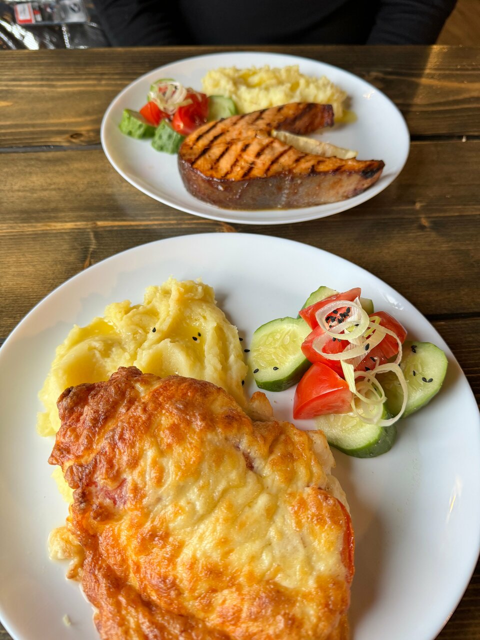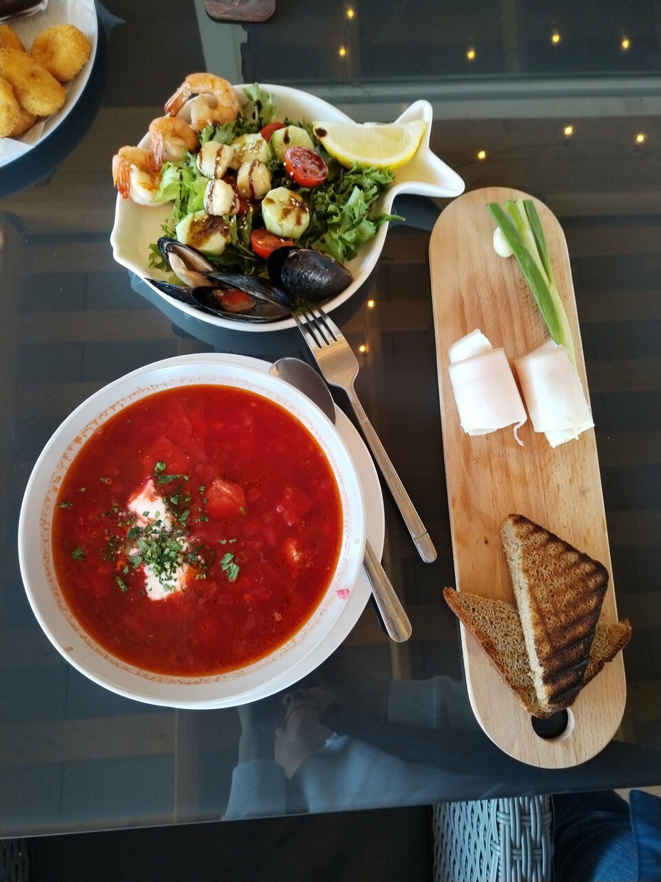 Очень неплохой борщ (с рюмочкой в качестве комплимента), блины с сёмгой тоже весьма вкусные. И порции огромные)