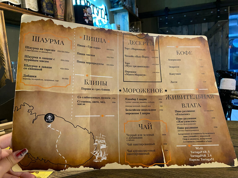 Режим работы: ежедневно с 10:00 до 22:00. Контакты: +7 (964) 307-42-47, +7 (921) 664-64-40. Сайт: http://tortuga51.ru/.