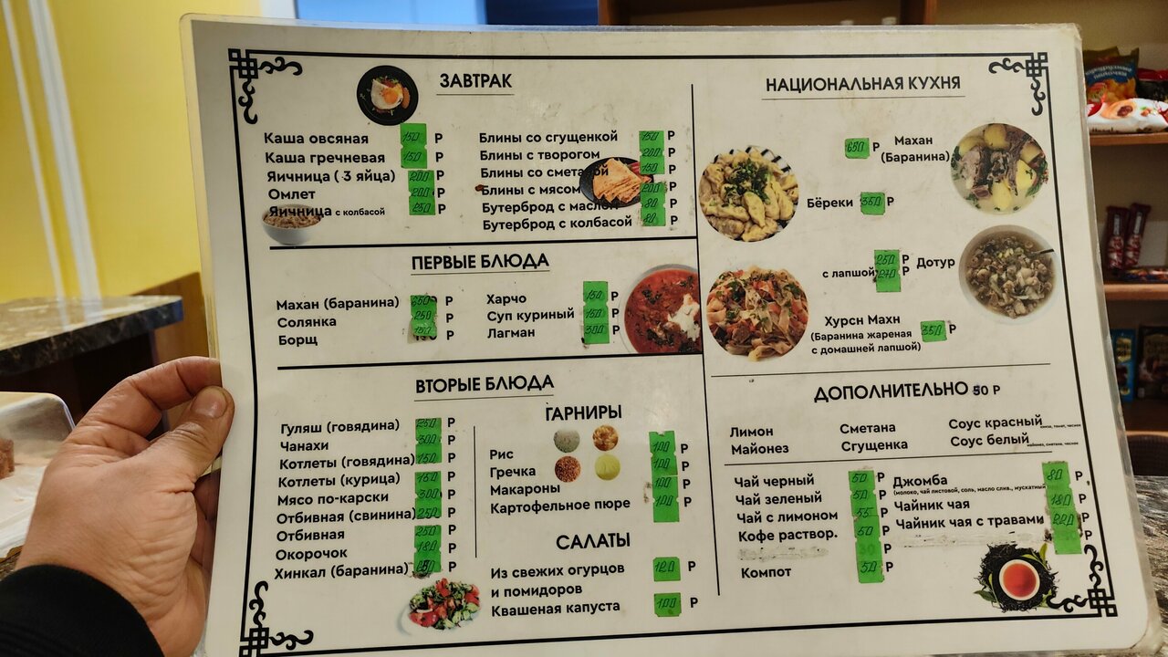- Чистое постельное белье, отсутствие паутины.; Гостеприимный персонал.; Вкусная еда в кафе, большие порции.; Домашняя столовая с хорошей кухней.; Вкусный калмыцкий чай.