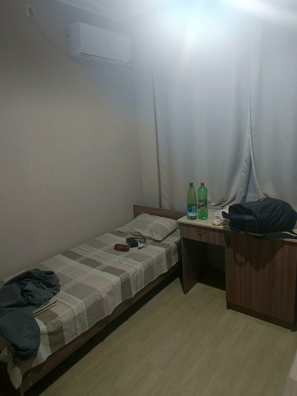 В коридоре пахнет чем то не приятным, оплата за сутки ,но сутки у них длятся до 12 дня,даже если заселитесь в 9-10 часов дня, комнатки уютные,туалет не приятно воняет , очень не приятно, есть фен,кровати удобные одноместные,в номере чисто, белье,полы шторы ,паутин тоже нет все хорошо
