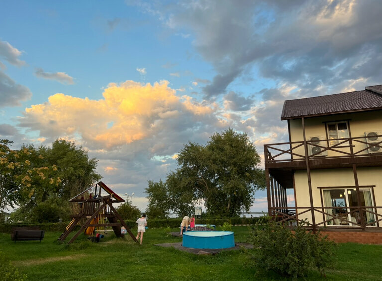 Хорошие номера. Есть не дорогой ресторан. Классное место для рыбалки. Есть катера на прокат. Можно купить удочку. Детские площадки. Охрана. Иногда приходят еноты. Сам видел! Единственное до них дорога очень плохая 3км. И все это на берегу Волги. Это круто. Советую