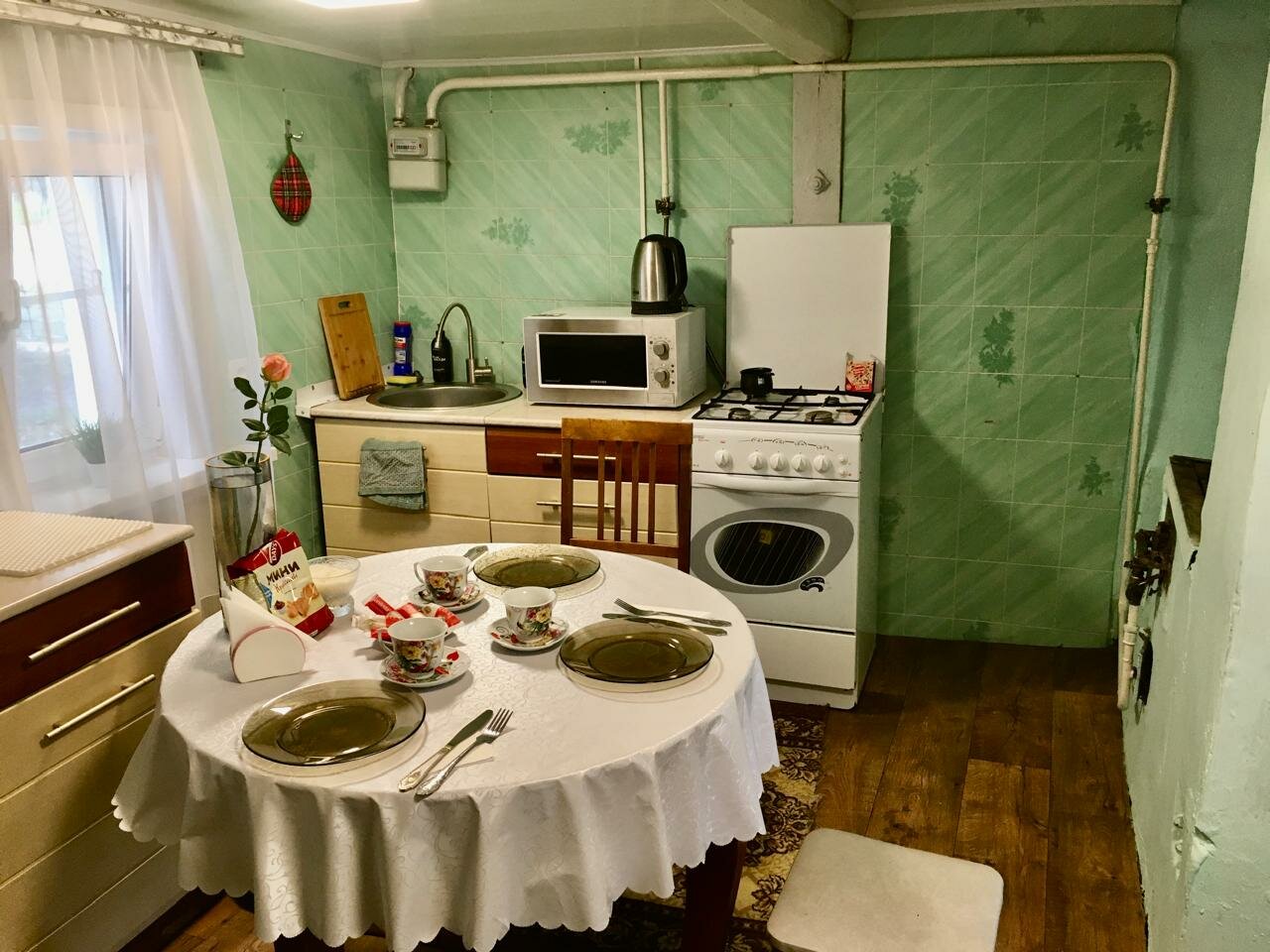 Уютный дом на Советкой, 26. Двор большой, для машины места много. Во дворе беседка, есть мангальчик. Три спальных места, спальные принадлежности, душ, вода и холодная и горячая (газовая колонка), мыльные принадлежности, туалет в доме, мебель, стиралка, утюг, чай-кофе, каша на завтрак, свч микроволновка, телевизор и wifi. Тихое место, расположение удобное. Хозяйка всегда на связи. Очень хороший вариант проживания! Рекомендую!