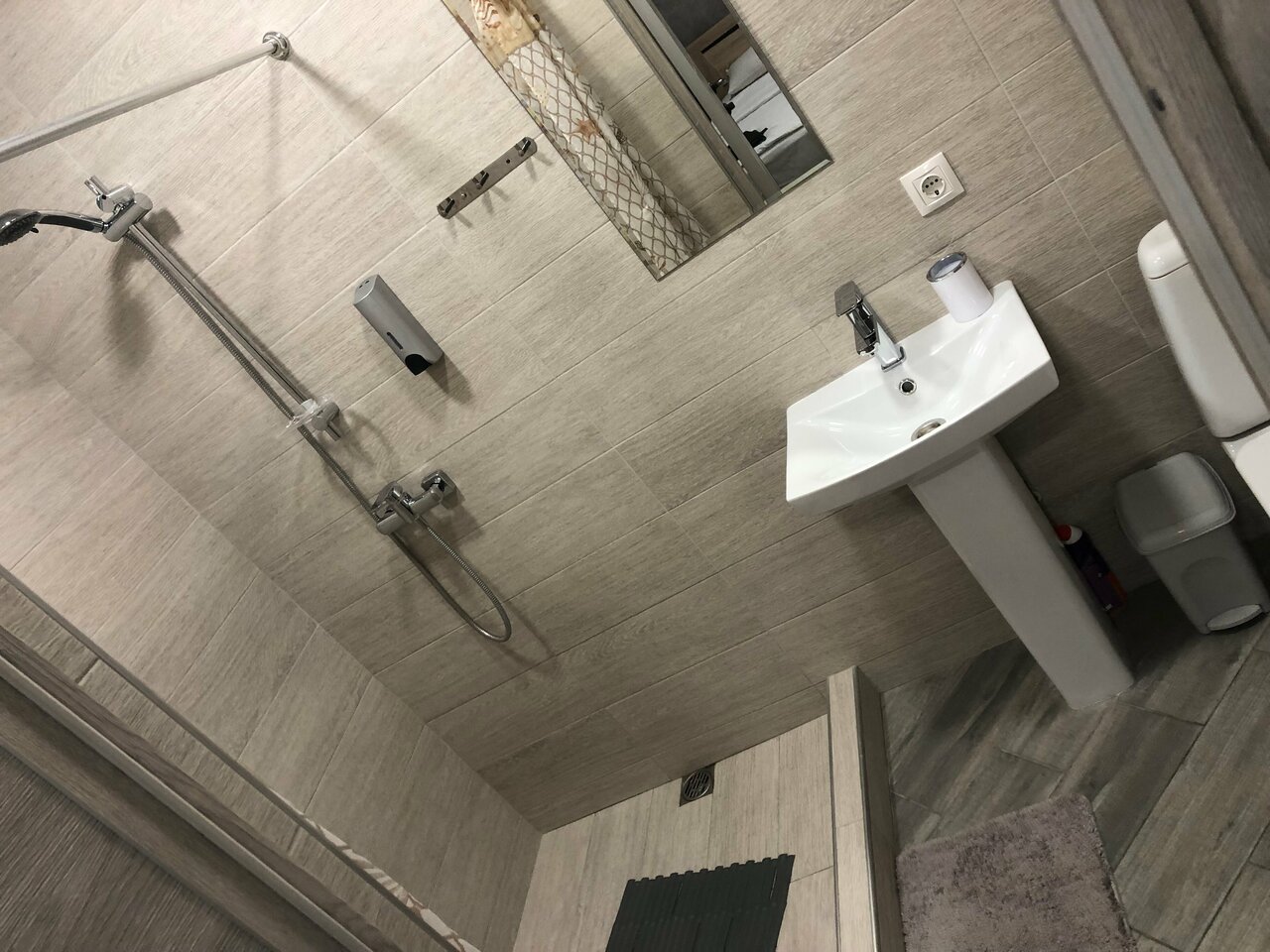 Один минус при размещении с детьми в номере — 2 двуспальные кровати. Было бы удобнее одну большую заменить на 2 односпальных. Возможно, оставался свободным только такой номер. Душ, туалет — нормальные.