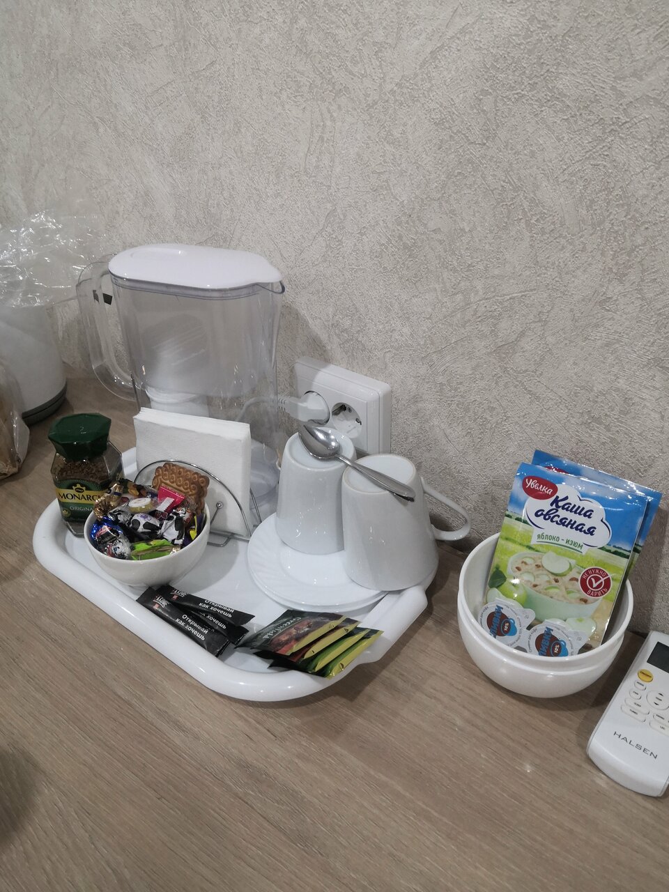 - Вкусный завтрак (каша, кофе, печенье, конфеты).