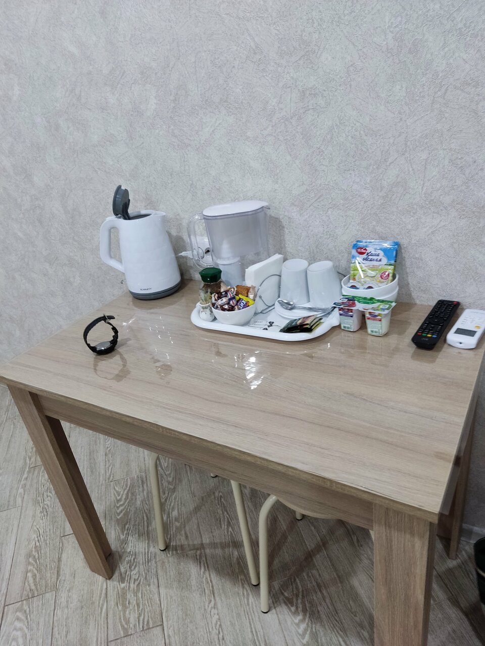 - Полный набор удобств (холодильник, микроволновка, чайник, кофе, чай).