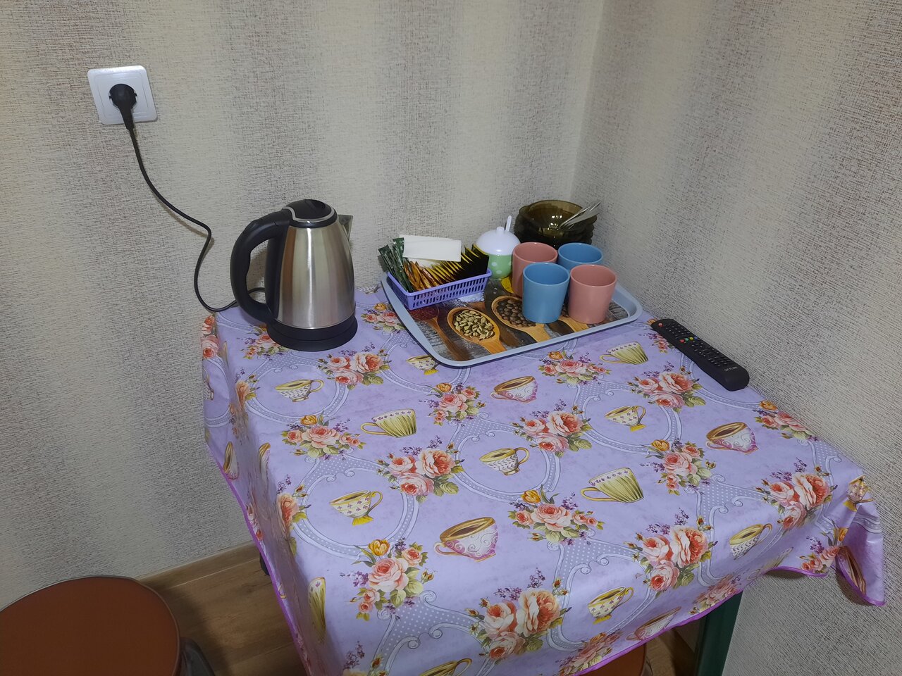 Очень чисто. Дружелюбные хозяева. В номере чайник, вода, тарелки, стаканы, ложки. Очень порадовало, что есть печенье, чай и даже каша! Всем советуем!