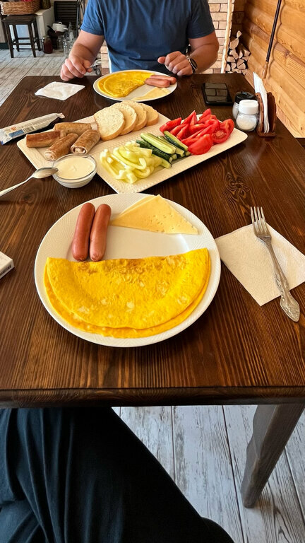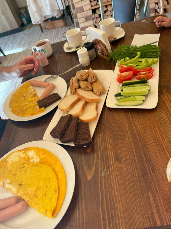 Хозяева очень гостеприимный. Встретили, предложили утром приготовить завтрак к назначенному времени. Утром нас накормили вкусным домашним завтраком, хлеб, блинчики с мясом, овощи со своего огорода, омлет, сосиски. То, что не доели, собрали с собой. В номере чисто, удобные кровати, ненавязчивый запах от ароматических палочек в санузле довергшает уютную атмосферу. Место, куда хочется вернуться