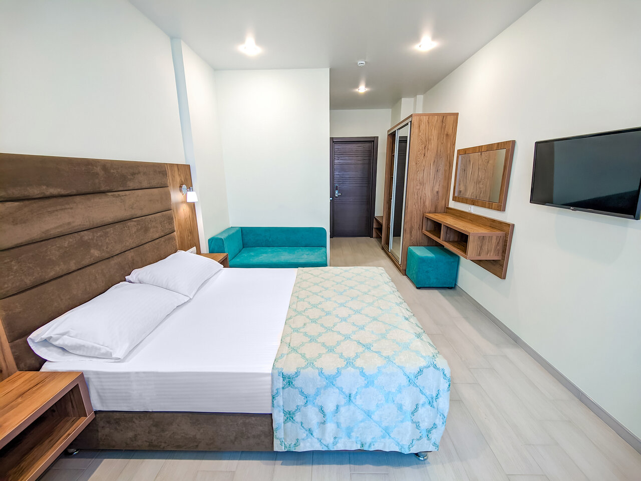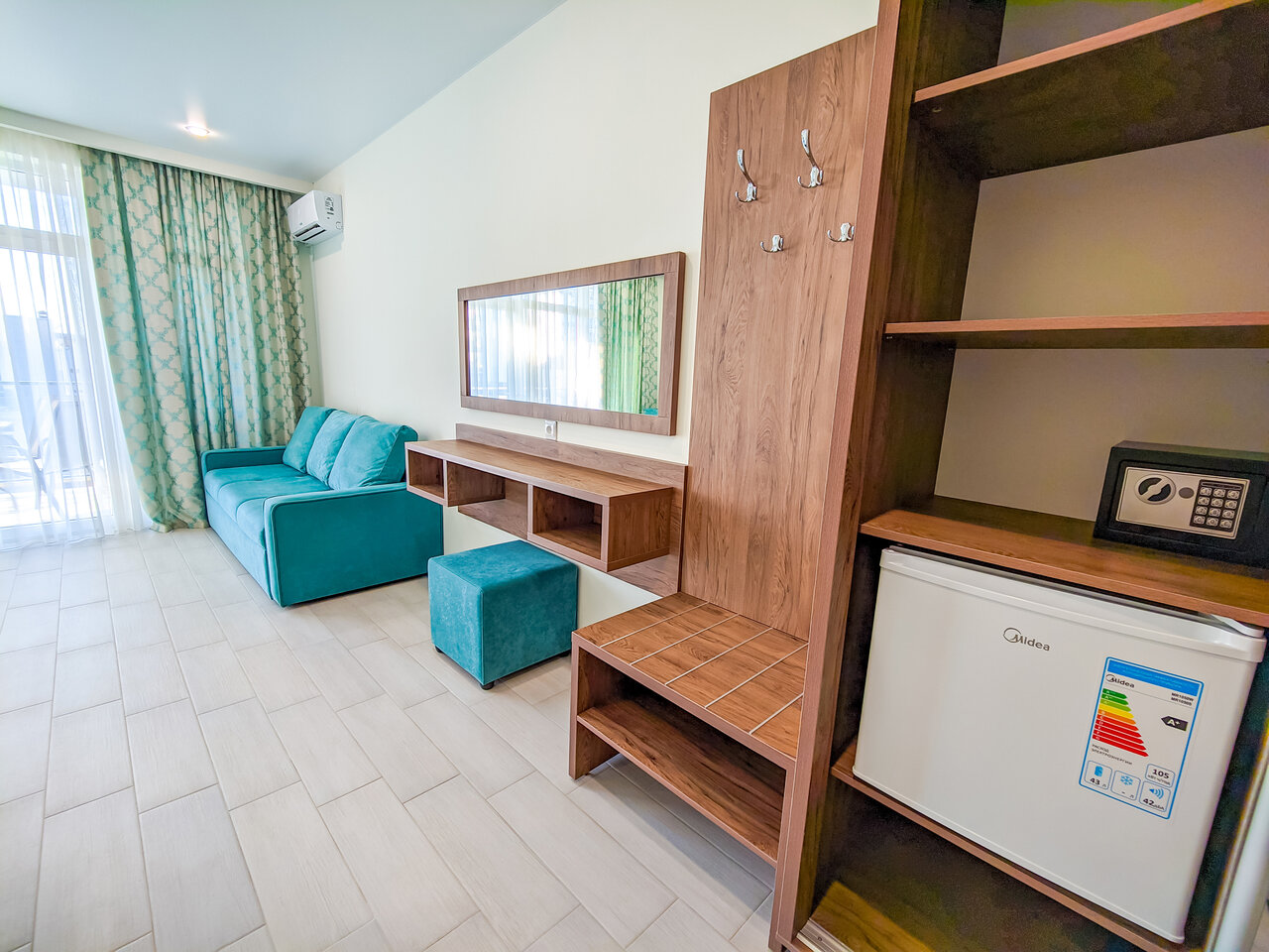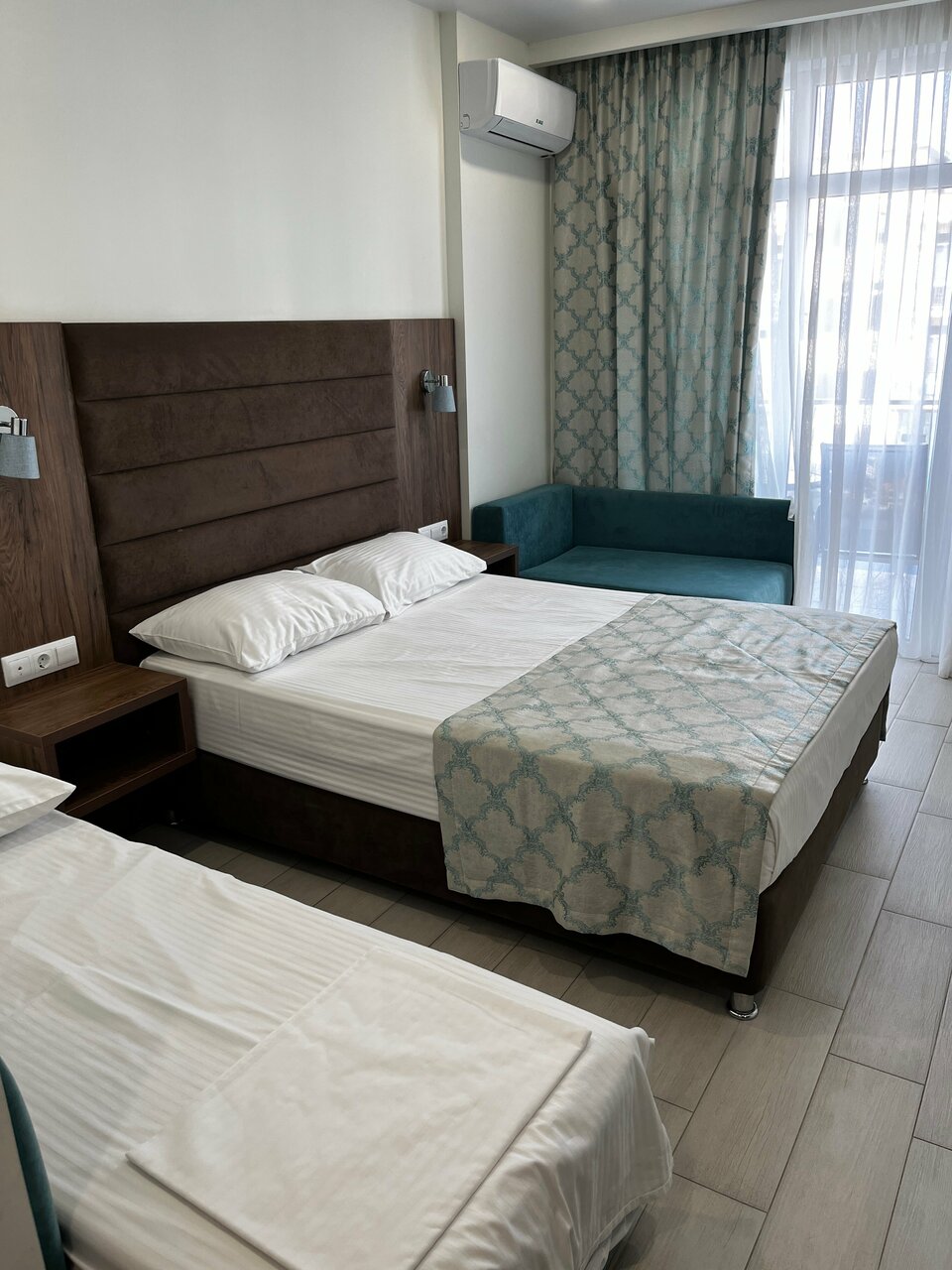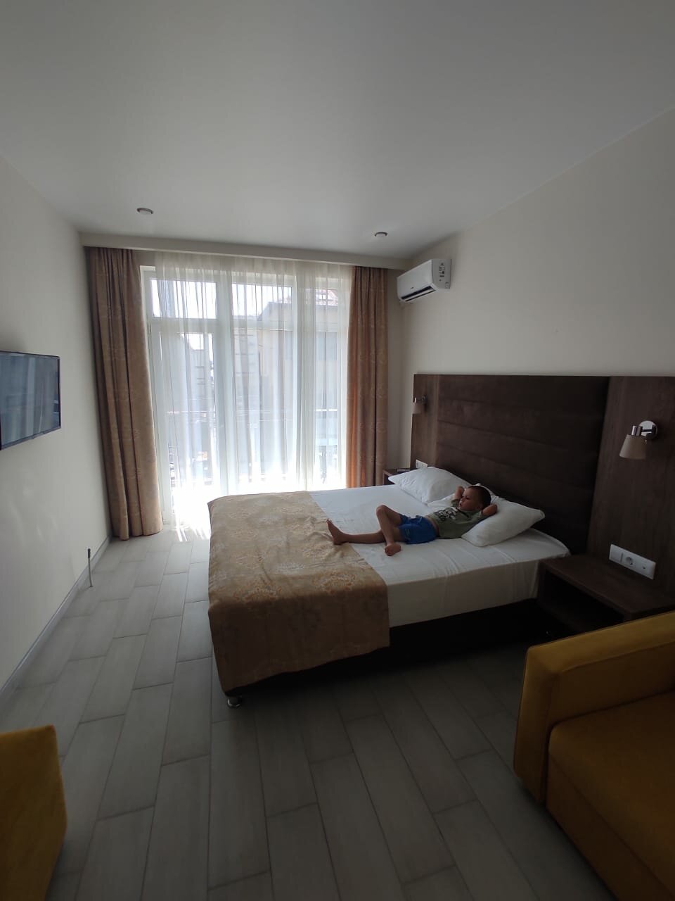 Отель расположен в 5 минутах от моря. Все новое мебель,сантехника. Уютная обстановка. В номере кондиционер,большое панорамное окно, просторный балкон со столиком и стульями. Всегда приветливый и отзывчивый персонал. Идеальная чистота. На территории бассейн со взрослой и детской зоной, детская площадка. Здесь можно отлично отдохнуть.Рекомендую!