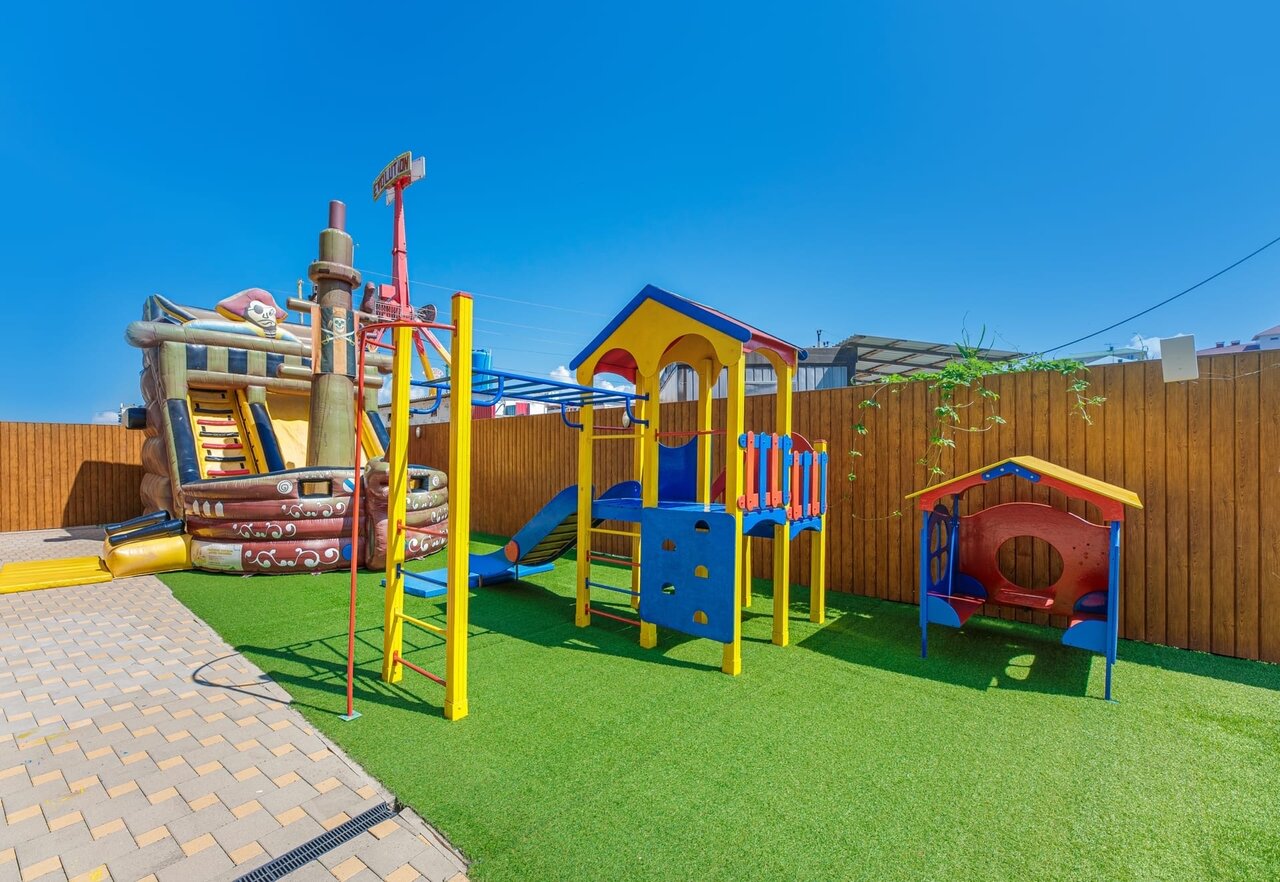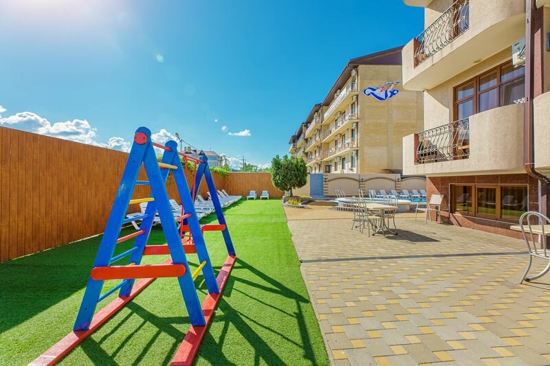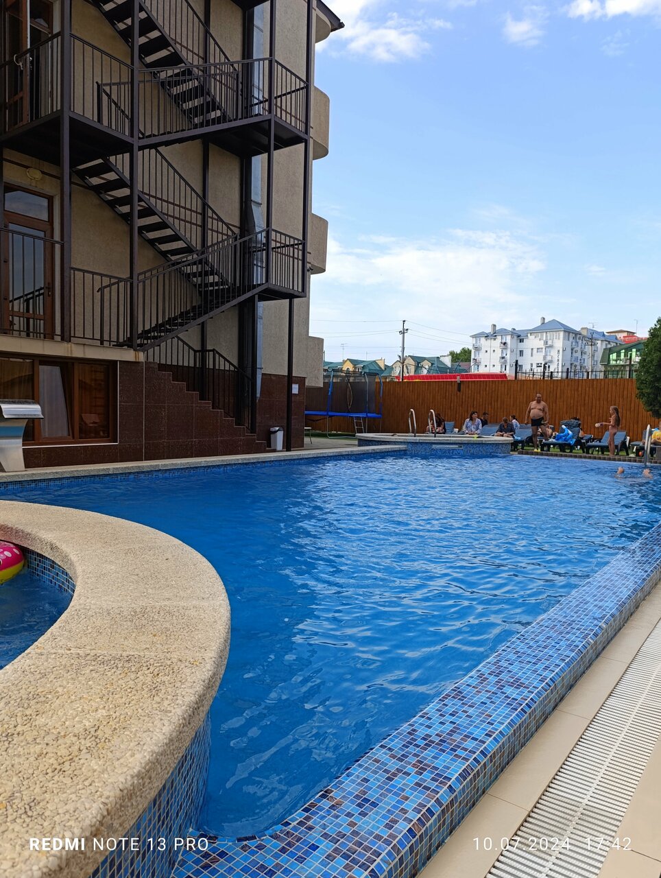 Очень понравилась гостиница. Чисто, хороший выбор номеров. Жили в студии 308. Вкусная и недорогая еда в столовой на цокольном этаже. Детская площадка большая, бассейны. До моря 10 мин максимум если прогулочным шагом. Всё рядом, расположение очень удачное.