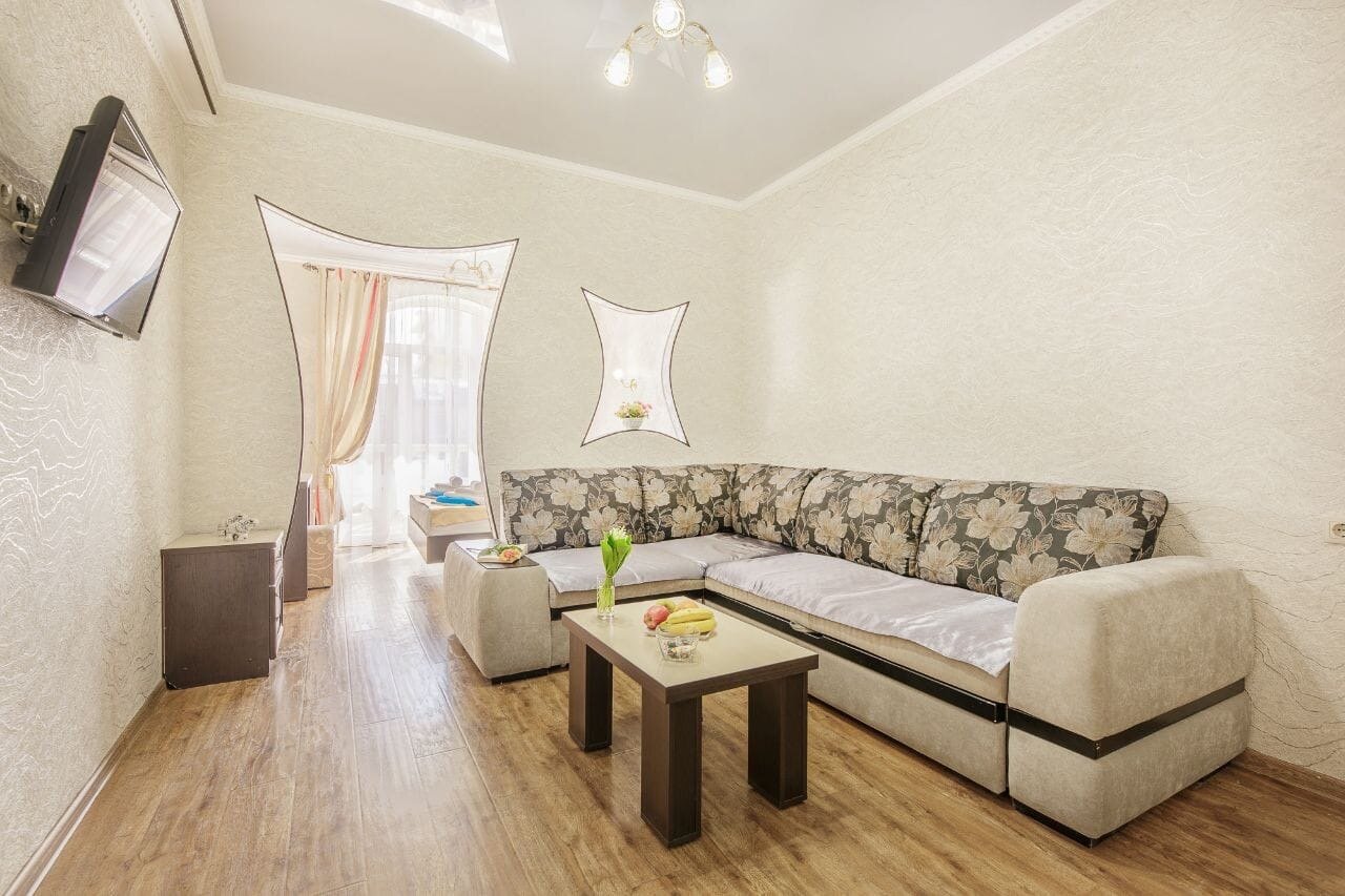 2 комнаты;Площадь: 30 кв. м.Санузел: душевая, туалет, фен.В номере:двуспальная кровать, диван двуспальный;прикроватные тумбочки;журнальный столик;шкаф;стол;пуфик;зеркало;телевизор ЖК;холодильник;сплит-система;кулер