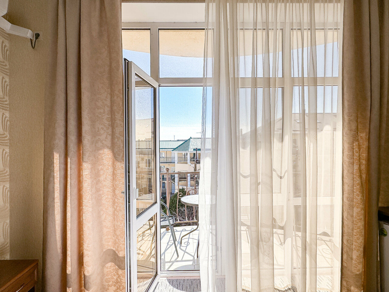 В номере есть душ и туалет (совмещенные), фен, кондиционер, телевизор, двуспальная кровать, кресло-кровать, шкаф, письменный стол, WiFi, холодильник, элчайник, комплект посуды: фужеры для напитков, чашки, тарелки. Просторный балкон с мебелью!