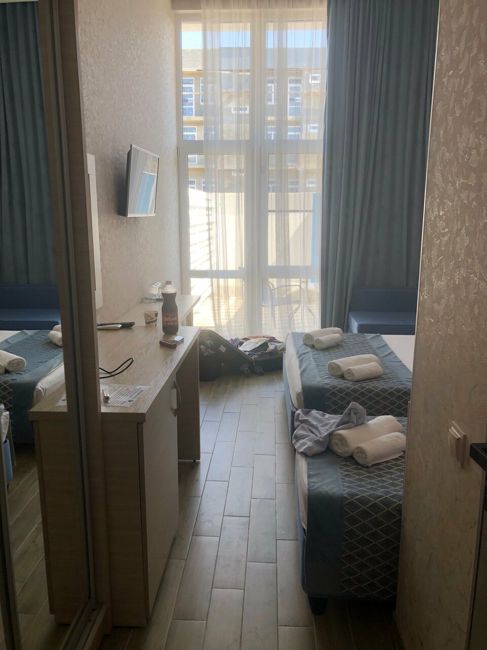 за свои деньги норм. из годного — новое здание, мебель и сантехника, наличие приятных балкончиков, парковка рядом и легкодоступна, хорошая шумоизоляция в номерах. что не понравилось — отсутствие ежедневной уборки (мусор будете носить сами, некоторые даже сумеют помыть пол ;)), такой себе вид из она (на пустыри и стройку или на парковку), для особей мужского пола не понравятся унитазы (надо умудриться чтоб хозяйство не упало на дно), шумный кондюк, невозможно оплатить кредитной картой ( только перевод, как и в большинстве заведений в Витязево). Вывод — за свои деньги очень даже не плохо, рекомендую. однако персоналу надо работать над сервисом (из мелочей складывается впечатление)