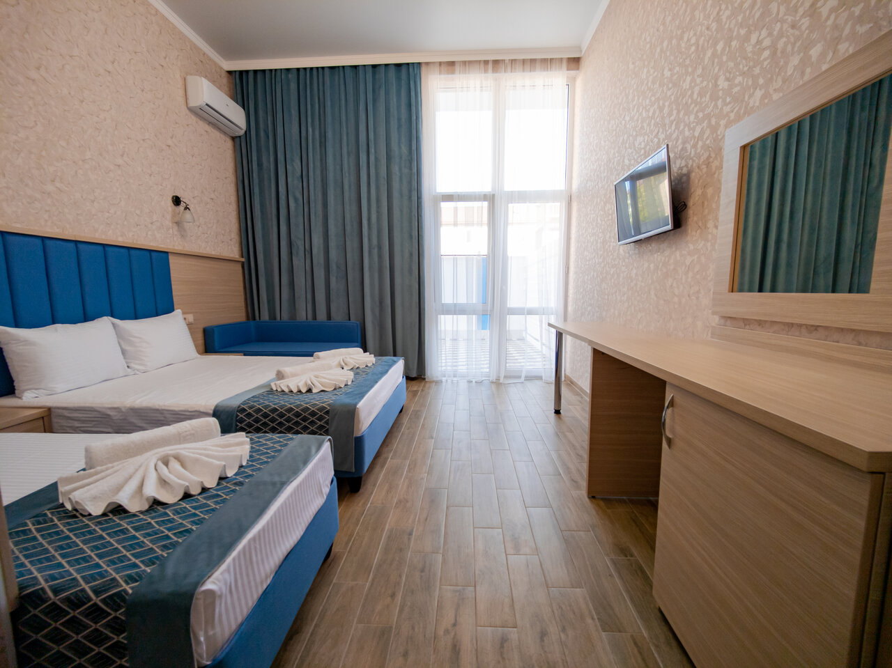 Удобства: — Номера с кондиционером, Wi-Fi, телевизором, холодильником, феном. — Открытый бассейн, детский бассейн, купальня, бар у бассейна. — Собственный песчаный пляж, детская площадка, летняя веранда. — Трансфер (аэропорт, вокзалы), парковка, камера хранения, сейф. — Ускоренная регистрация (заезд с 14:00, выезд до 12:00).