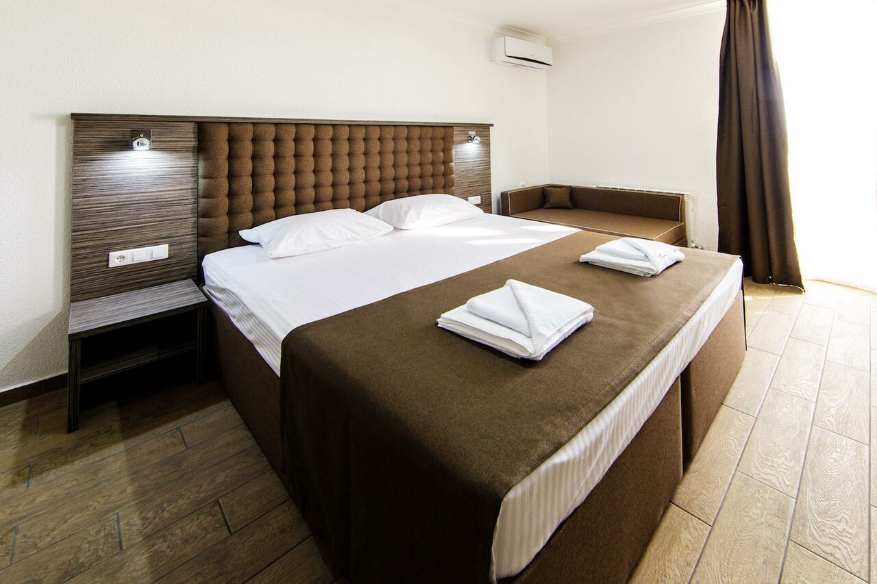 Удобства: — Номера с кондиционером, Wi-Fi, телевизором, санузлом и звукоизоляцией. — 2 бассейна (включая детский и подогреваемый), собственный песчаный пляж, шезлонги. — Ресторан с полным пансионом, детское меню, летняя веранда. — Бесплатная парковка, лифт, прачечная, платный трансфер. — Услуги для детей: анимация, площадка, кроватки (бесплатно для 0–3 лет).