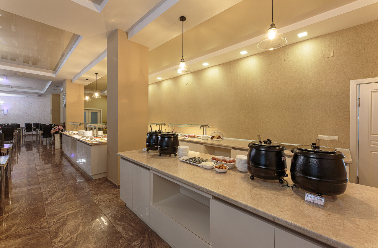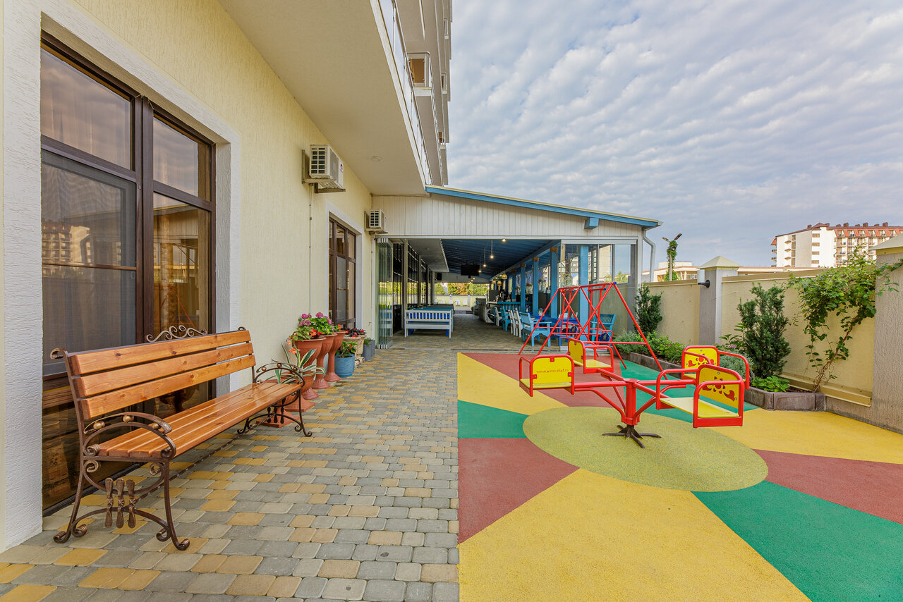 Отель очень понравился! Здание новое, номера большие, удобные. Есть балкон (там сушилка, стол и стульчики). В номере есть чайник, чашки, стаканы, холодильник. Шампунь и гель для душа пополняют по необходимости. В коридоре на каждом этаже гладильная доска, утюг, кулер. Уборка очень качественная. Сотрудники очень внимательные и вежливые. Питание нормальное, 4 вида супа, гарнира, вторых блюд, салаты в основном овощные. Для детей питание подходящее. Из напитков различные виды чая, кофе растворимый (не пробовала), сокосодержащие напитки. На обед компот, на завтрак йогурт. Из выпечки в основном бисквиты, из фруктов — сливы, апельсины и яблоки. В ресторане есть детские стульчики. Бассейн тёплый, работает до 23 часов, были дни, когда лежаков на всех не хватало. Полотенца выдают. Есть детская площадка, детская анимация (больше подходит для малышей). Расположение отеля очень удобное, до моря минут 10-15 (проход по очень многолюдной улице, с различными торговыми точками, столовыми и т. п.)