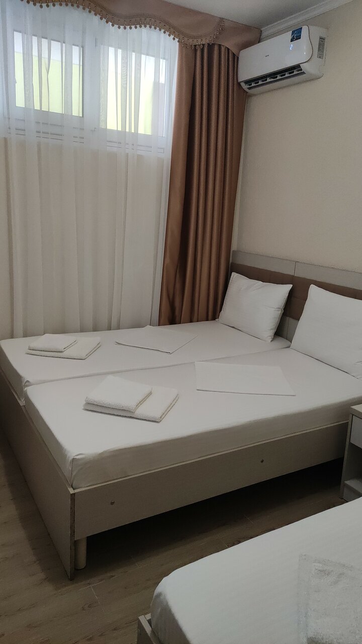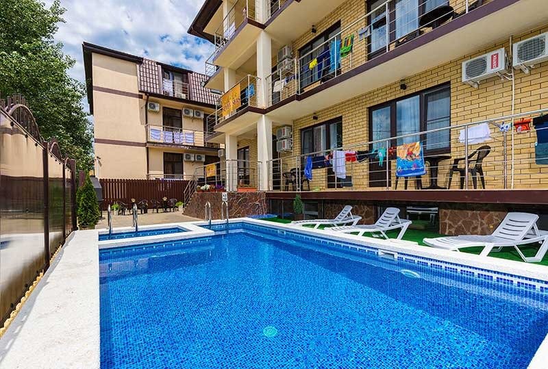 Предлагает номера (2000–5500 ₽/ночь) с кондиционером, Wi-Fi, телевизором, санузлом и звукоизоляцией. На территории: открытый подогреваемый бассейн, детский бассейн, песчаный пляж, столовая, бесплатная парковка. Доступны услуги трансфера (платно), детская анимация, площадка, кроватки (бесплатно для детей до 3 лет).