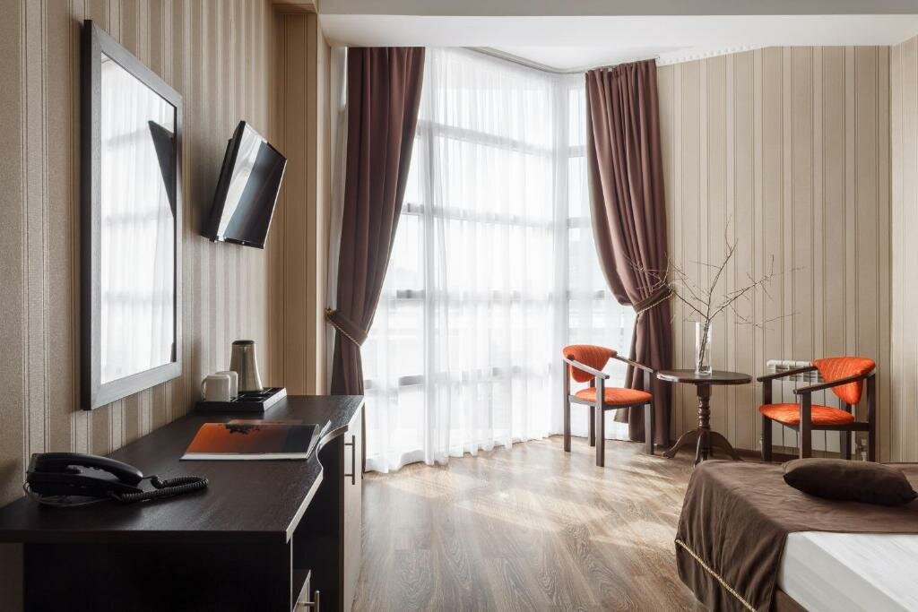 Вид из окон очень красивый, расположение хорошее, необычные и добротные окна в номере. Минус: высокая слышимость в люксе шума из коридора. А еще поразила плесень в ванной и в бассейне, рассохшиеся плинтуса, безумно скользкий пол перед сауной и бассейном. Не тот уровень для подобного рода гостиницы..