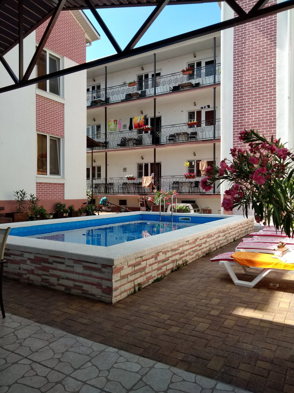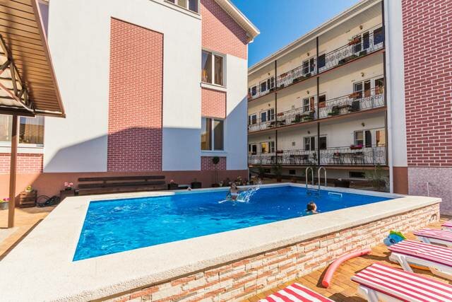 Хорошее место для проживания на отдыхе. В номерах чисто, мебель и бельё чистые состояние практически нового интерьер современный. Номер по размерам достаточный, свободный, вода горячая и холодная, душ и туалет в номере все в кафеле. Просторная столовая в отдельном помещении, никакой тесноты кругом кафель, в жаркий день прохладно в помещении, что приятно. Номера для проживания удачно расположены солнце только утром на час заглядывает и нет дневной духоты, в номерах кондиционеры и телевизоры. Есть бассейн вода в нем теплая. Номера убираются персоналом, от моря достаточно не далеко и не слышно музыку постоянную из детских баз отдыха.