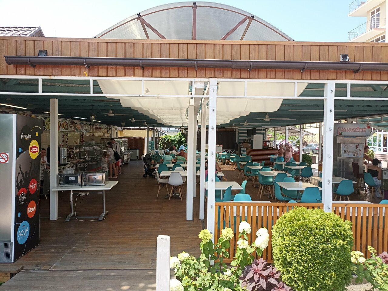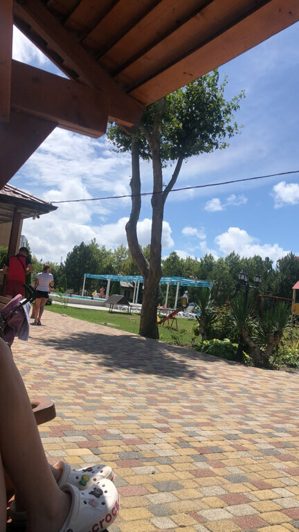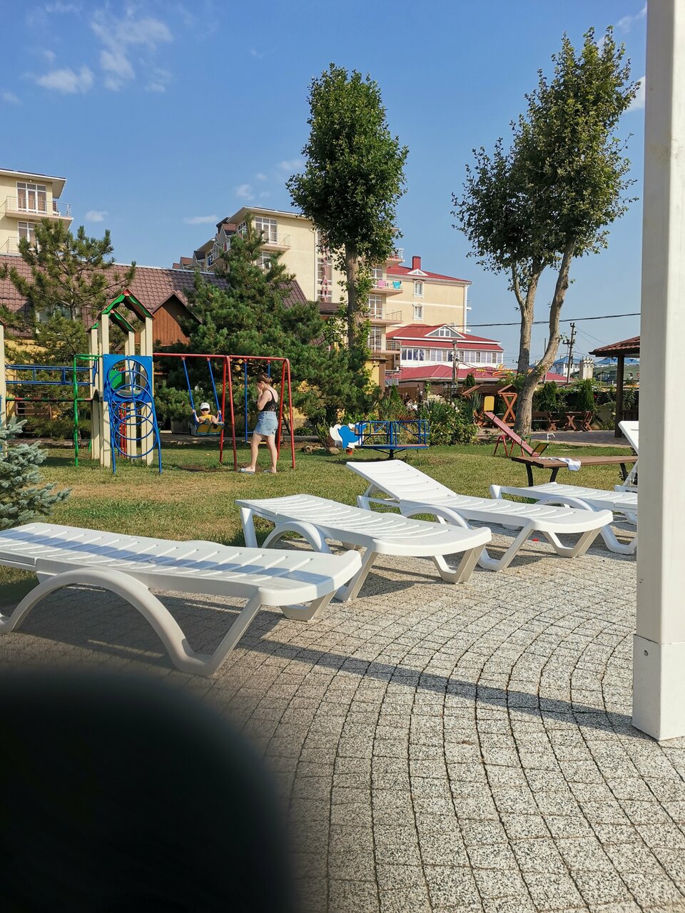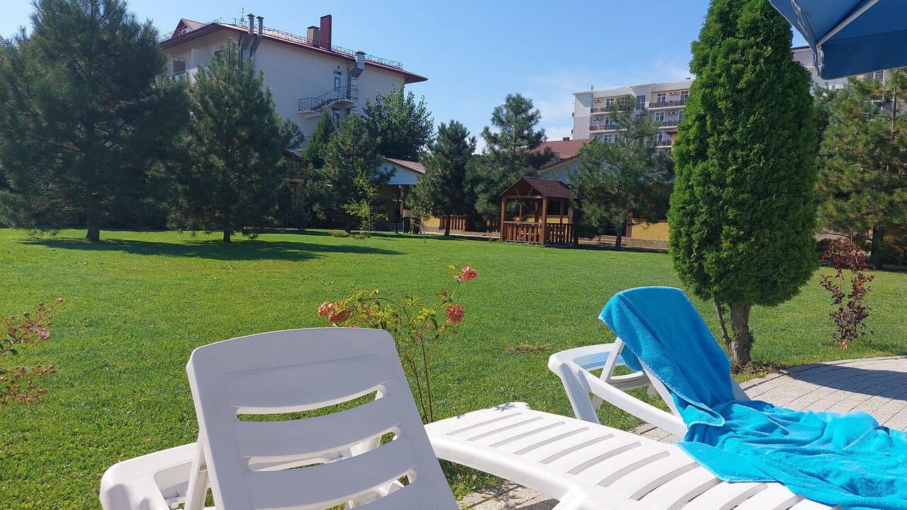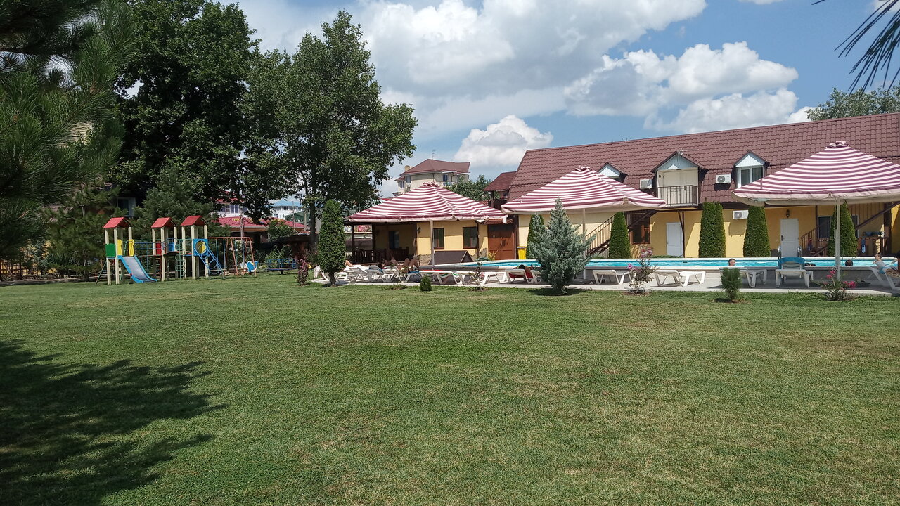 Хорошая база отдыха,замечательная зеленая территория,большой бассейн,до моря минут 7 ходьбы.Жили в одноэтажном номере со своей террасой,остались очень довольны.Отдых понравился