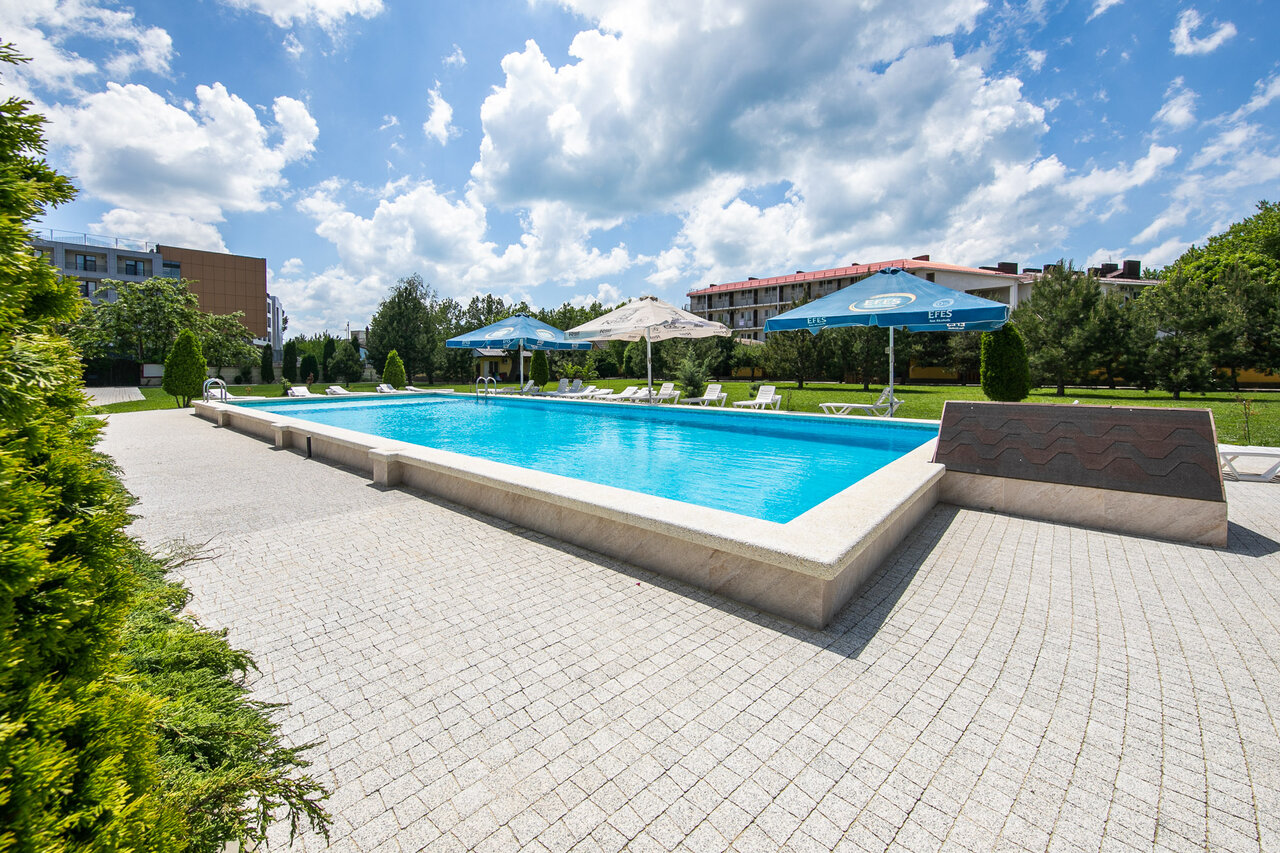 Уютное место недалеко от моря есть своя парковка закрытая территория , есть свой пляж и большой и чистый бассейн на территории отеля