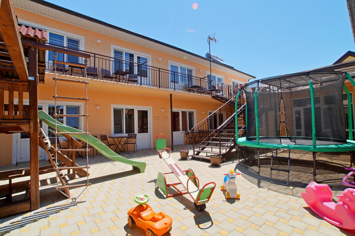 Отдыхали в июле 2022г. Хорошие номера со всем необходимым (телевизор, холодильник, сплит-система). Около номеров есть места отдыха. Кухня современная, полностью укомплектована, много посуды. Отличная игровая зона, много игрушек, горка, батут, тенис, бассейн. Во дворе всегда чисто. Фото все соответствуют действительности на 100%. Хозяева гостеприимные, отзывчевые. До моря минут 20 не быстрым шагом. Отличное место для отдыха с детьми, рекомендуем!