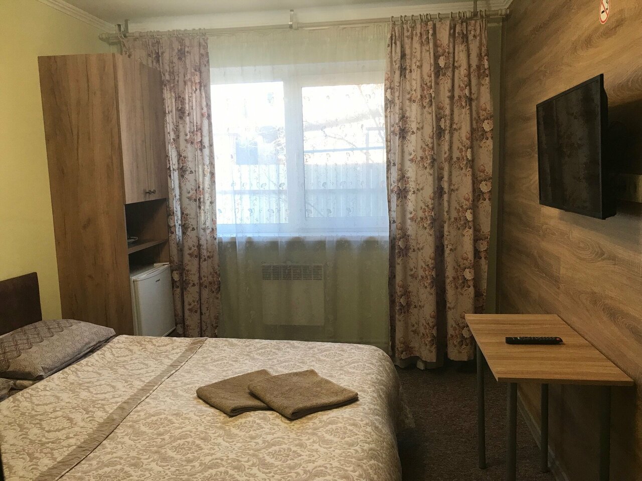 Двухместная комната с одной большой кроватью. Все удобства в комнате: душ, туалет, удобная кровать, постельные принадлежности, посуда, холодильник, телевизор, чайник, шкаф для одежды, стол. Имеется парковка, вайфай, отчетные документы.