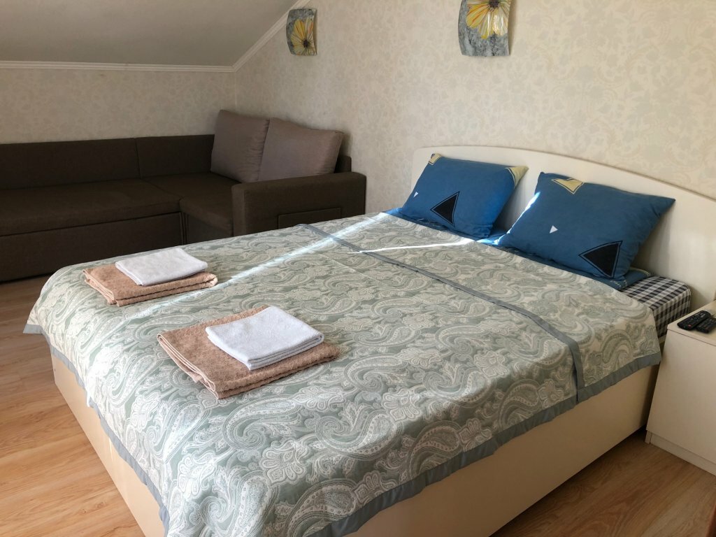 Комната: двухместный двухкомнатный люкс с балконом с одной большой кроватью и диваном. Все удобства: душ, туалет, удобная кровать, постельные принадлежности, посуда, холодильник, телевизор, чайник, шкаф для одежды, стол. Парковка, вайфай, документы.
