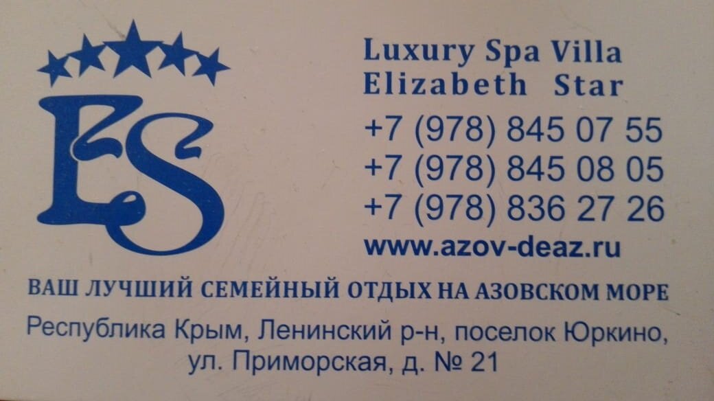 И снова мы в Крыму на лазурном берегу азовского моря ! Конечно же на Спа Вилле Элизабет Стар бухта Булгонак, отдыхали второй раз так как очень понравилось нам с супругой пляж хороший песок чисто . уют спокойный отдых домашнее вино у бассейна лежаки, еду заказываем из города в номерах свежесть белья и приятный запах рекомендую